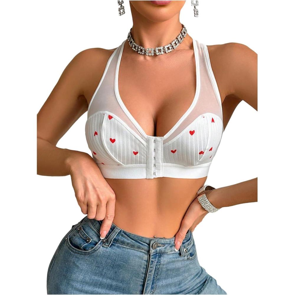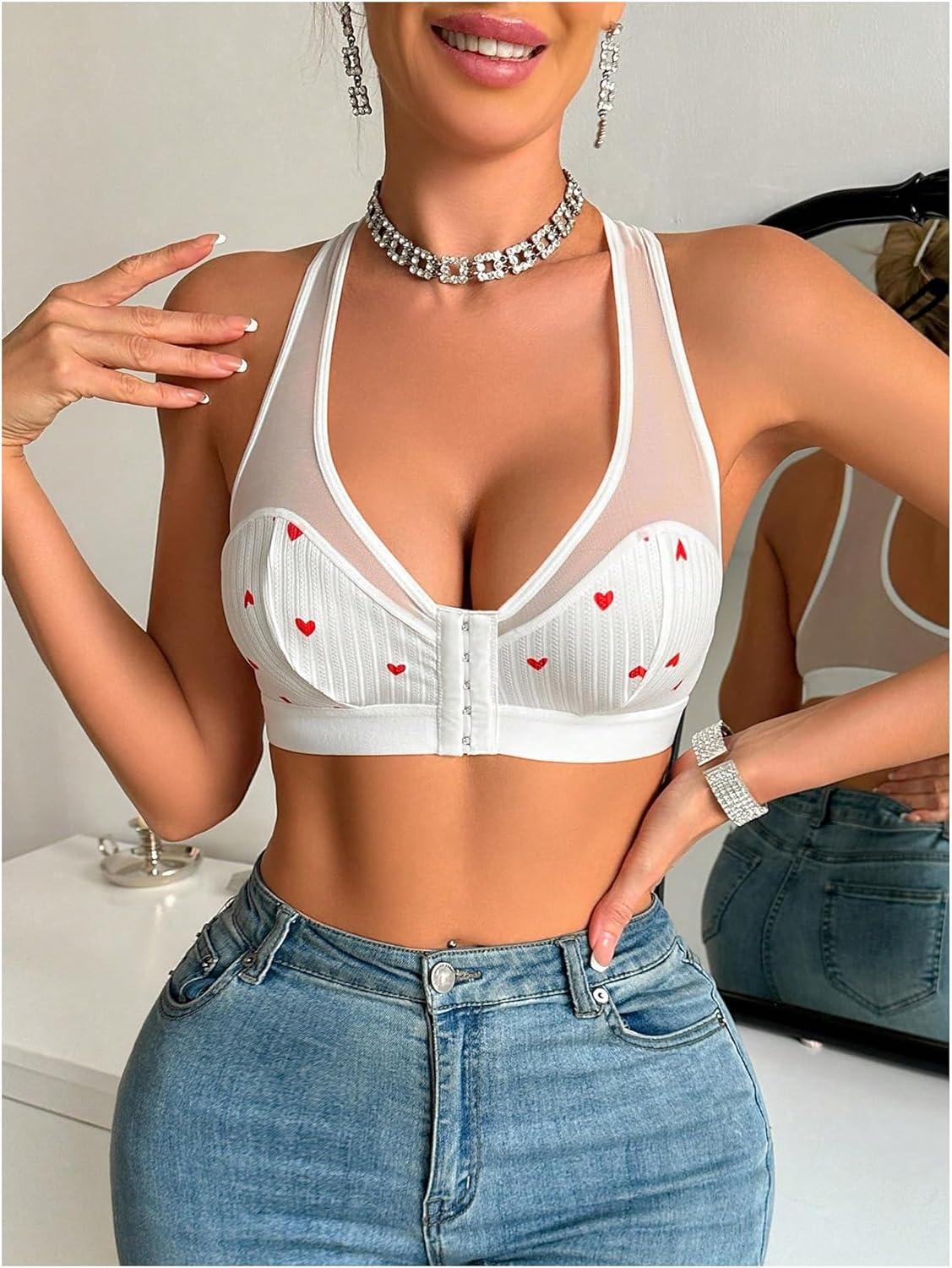 imageOYOANGLE Womens Heart Print Mesh Front Closure Wireless Bra Comfortable No Underwired Racerback BrasWhite