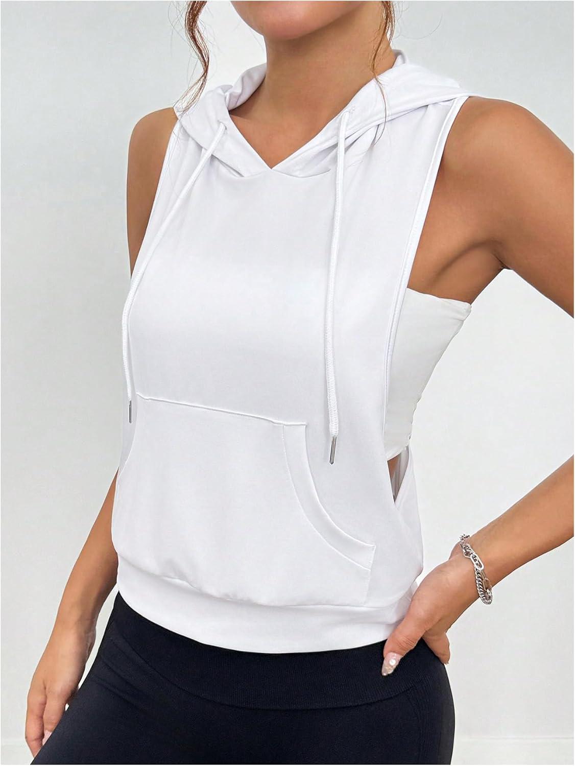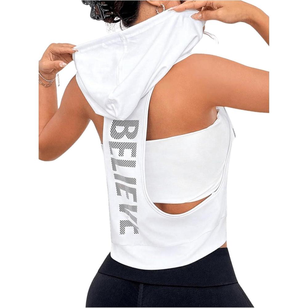 OYOANGLE Women’s Letter Print Workout Hooded Tank Tops Sleeveless Open Side Racerback Athletic Gym Tops(White)