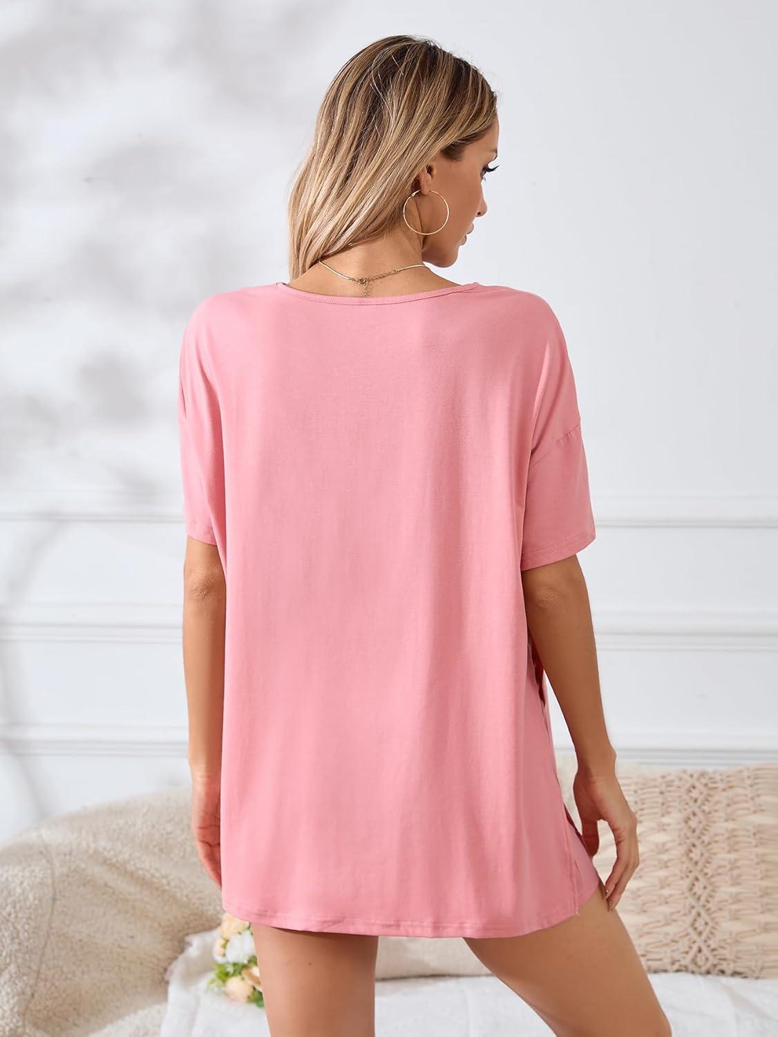 OYOANGLE Women's Maternity 2 Piece Outfits Short Sleeve Split Hem Tee Shirt and Shorts Set(Dusty Pink)