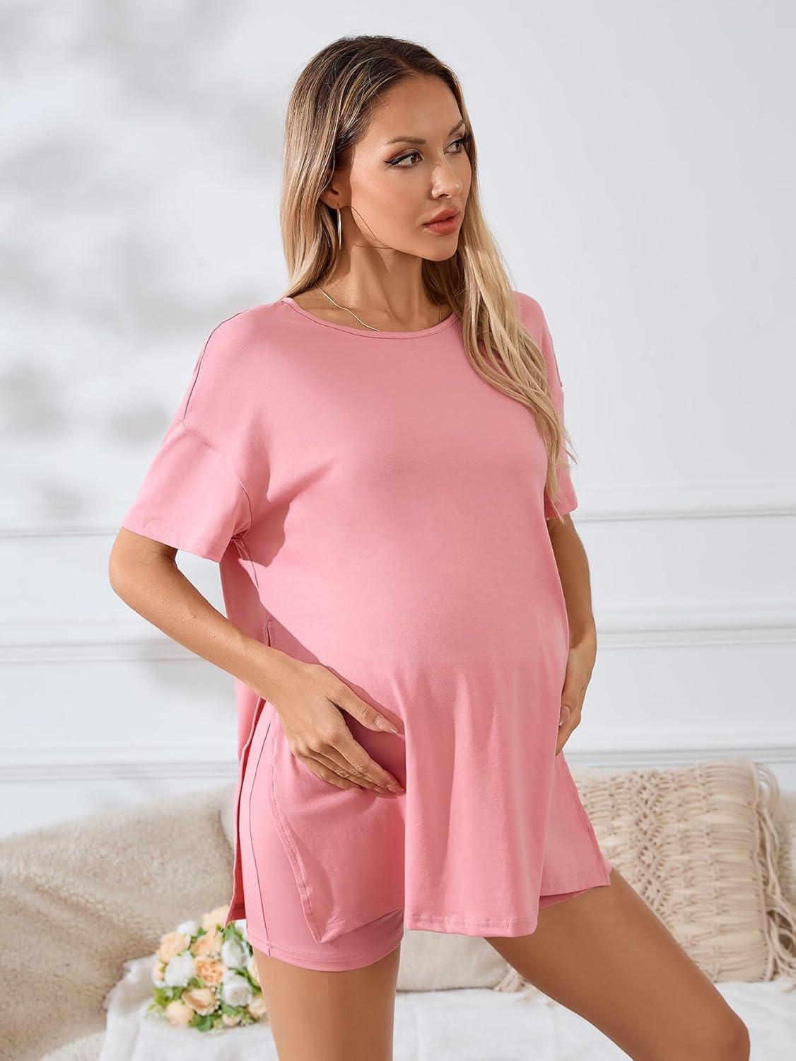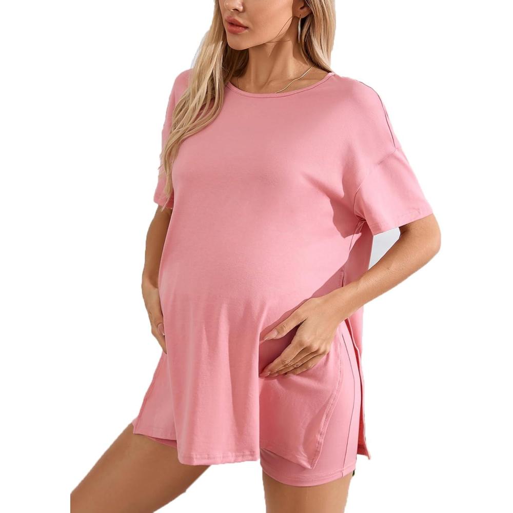 OYOANGLE Women’s Maternity 2 Piece Outfits Short Sleeve Split Hem Tee Shirt and Shorts Set(Dusty Pink)