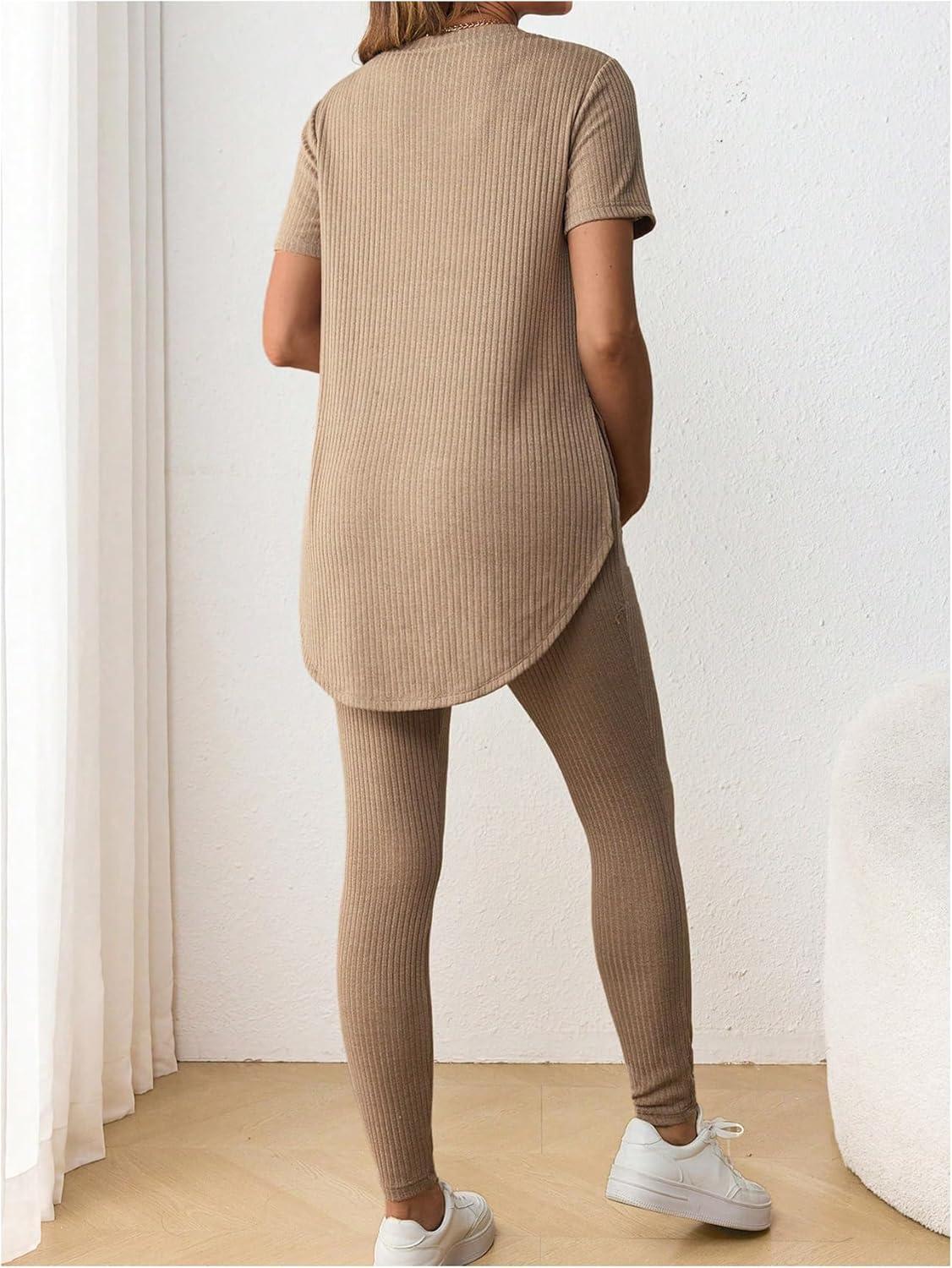 OYOANGLE Women's Maternity 2 Piece Ribbed Knit Lounge Set Short Sleeve T-shirt and Legging Pants Fall Outfits(Khaki)