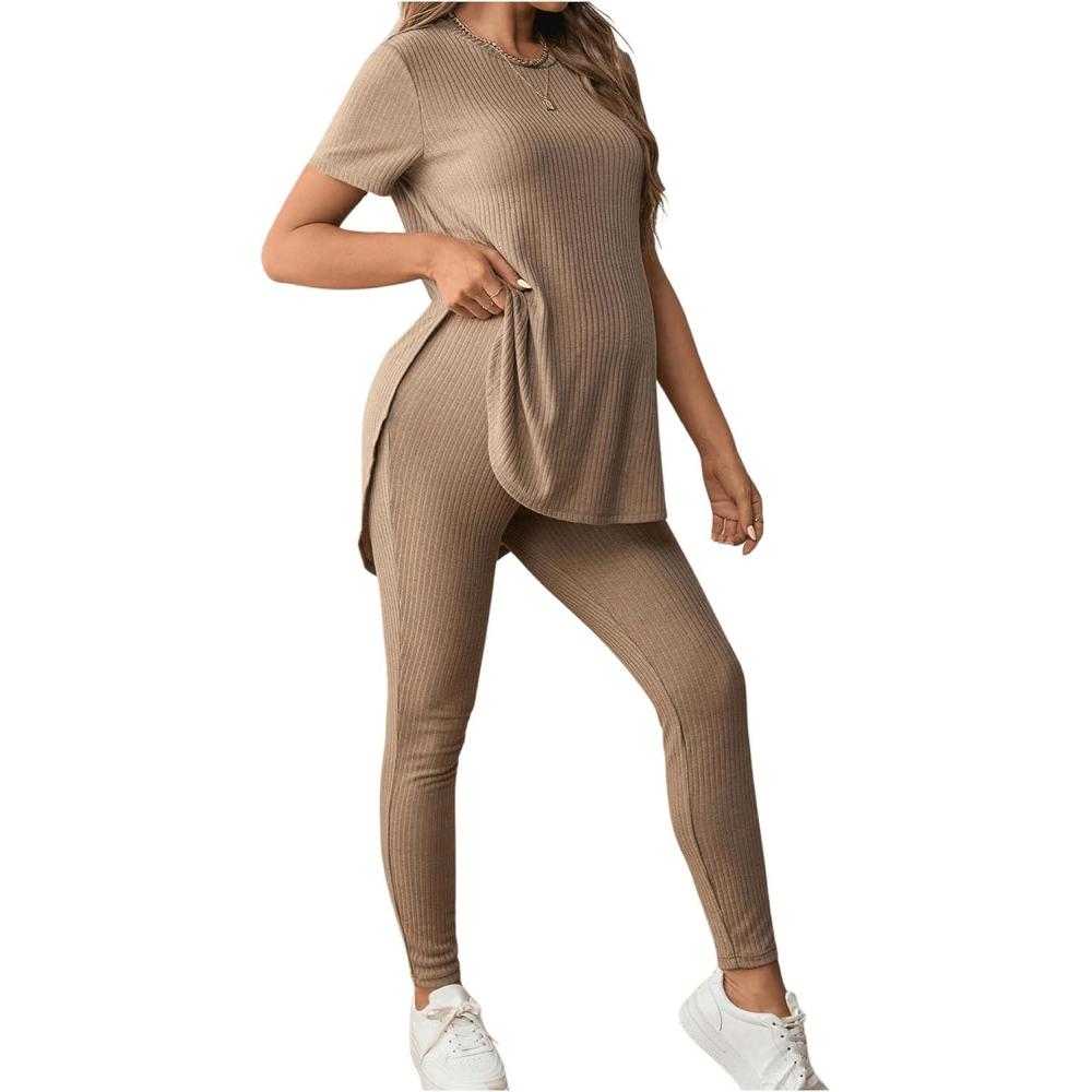 OYOANGLE Women’s Maternity 2 Piece Ribbed Knit Lounge Set Short Sleeve T-shirt and Legging Pants Fall Outfits(Khaki)