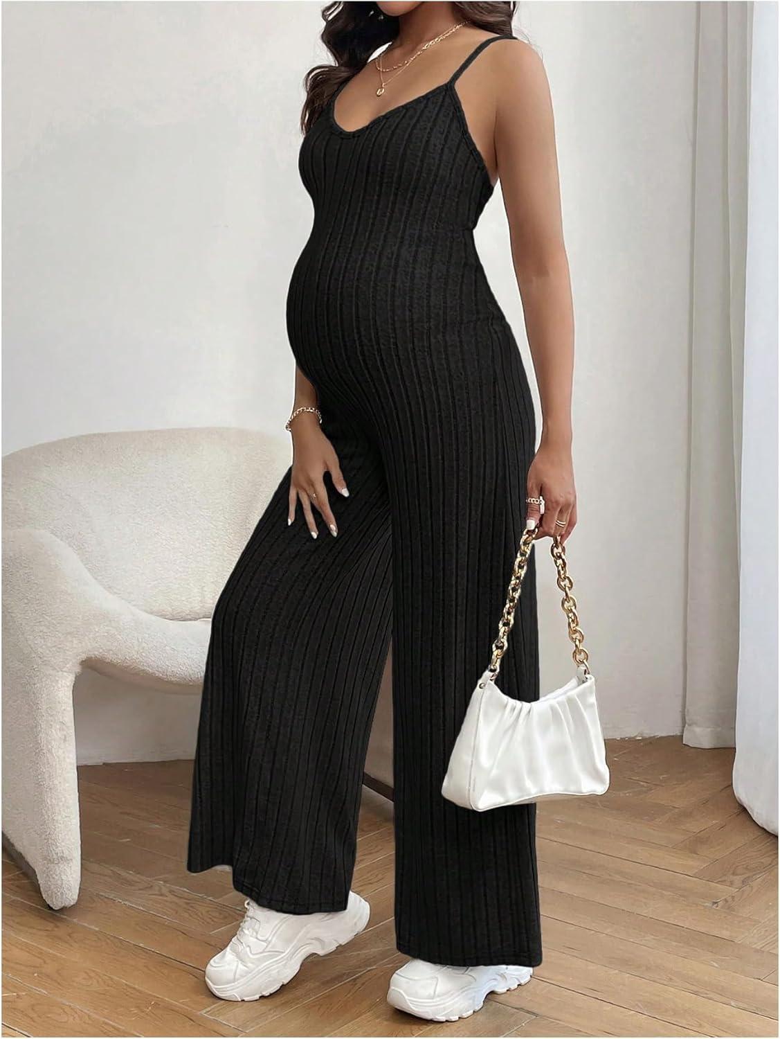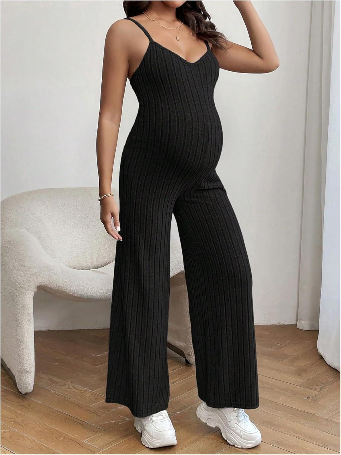 OYOANGLE Women's Maternity V Neck Spaghetti Strap Ribbed Knit Long Pants Jumpsuits(Black)