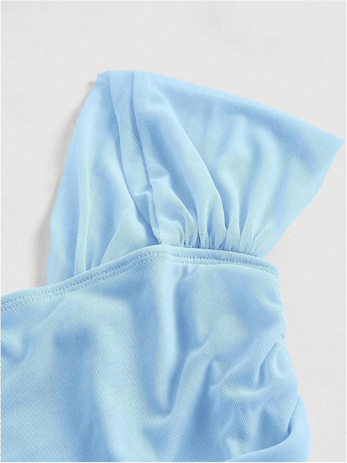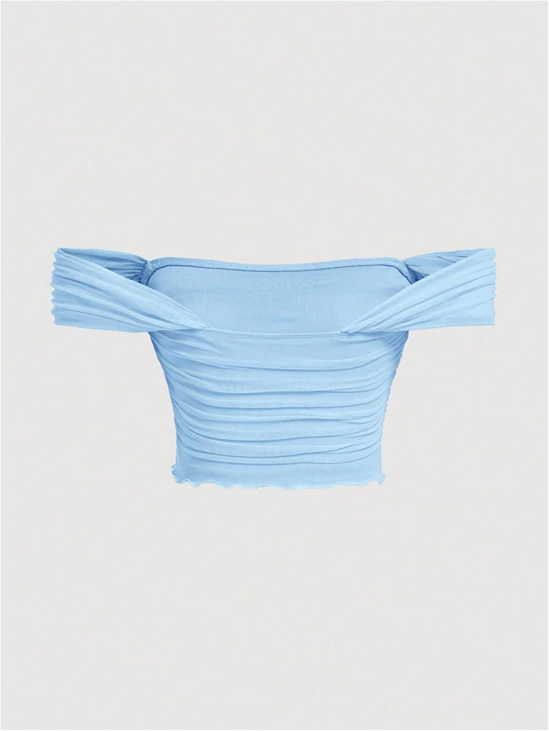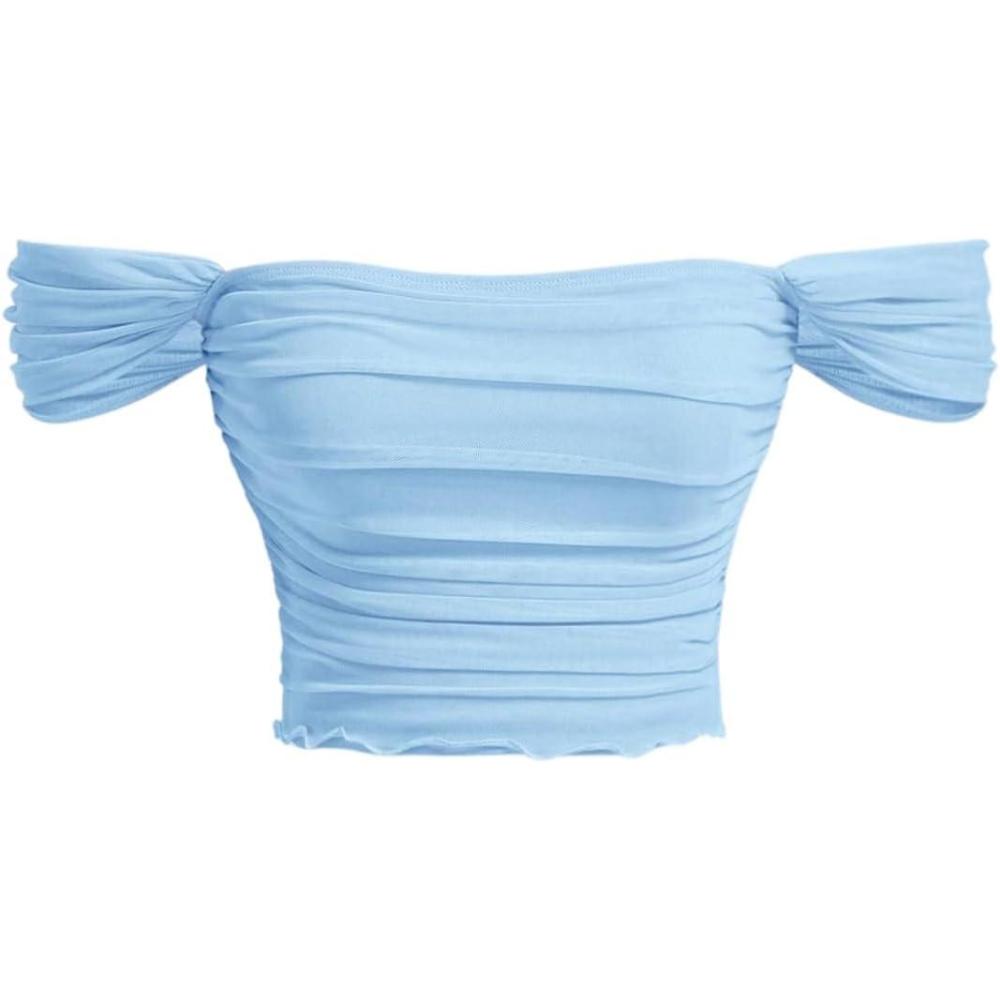 OYOANGLE Women's Off Shoulder Ruched Lettuce Trim Mesh Short Sleeve Tee Shirts Solid Slim Fit Crop Tops(Blue)