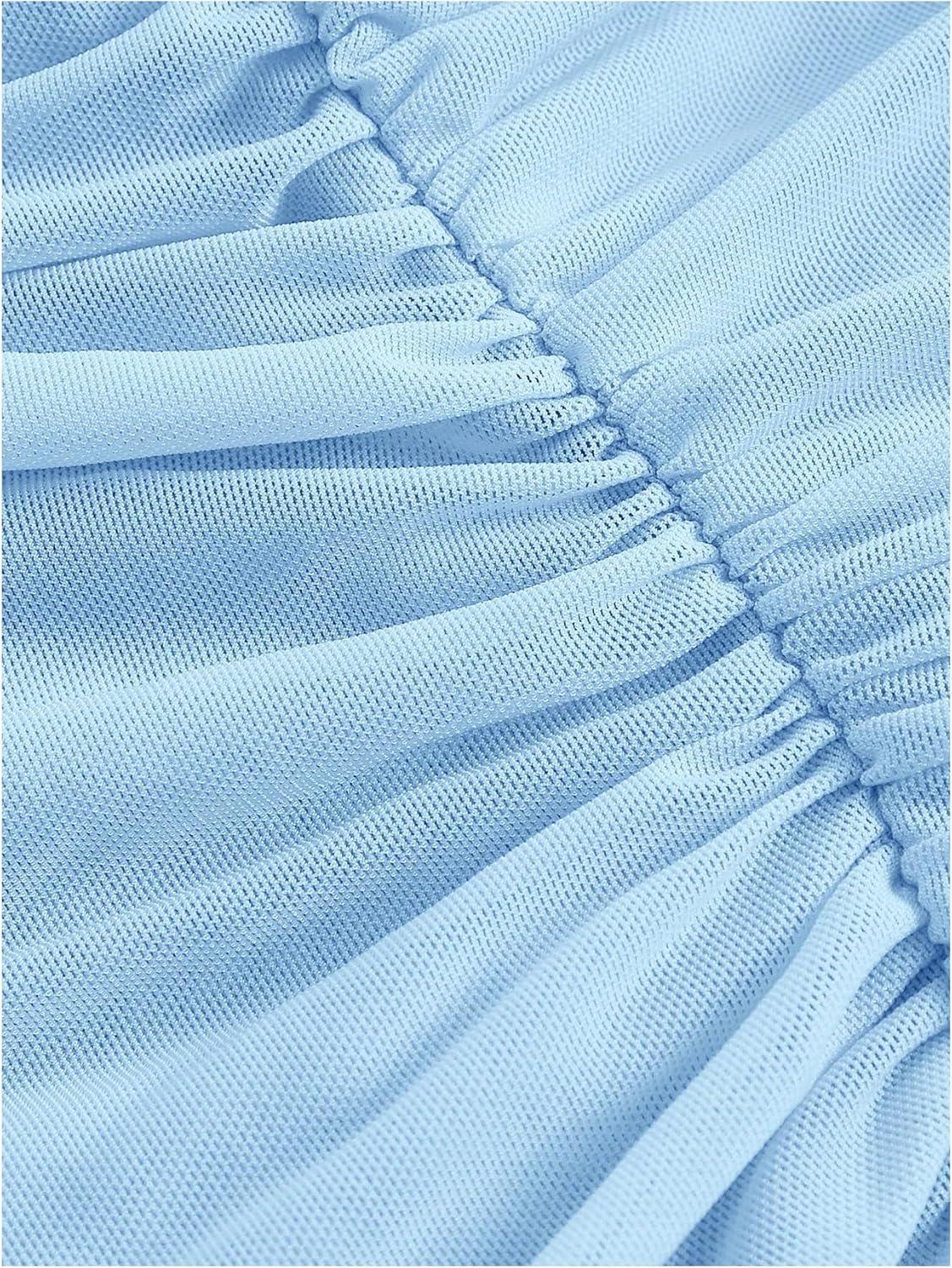 imageOYOANGLE Womens Off Shoulder Ruched Lettuce Trim Mesh Short Sleeve Tee Shirts Solid Slim Fit Crop TopsBlue