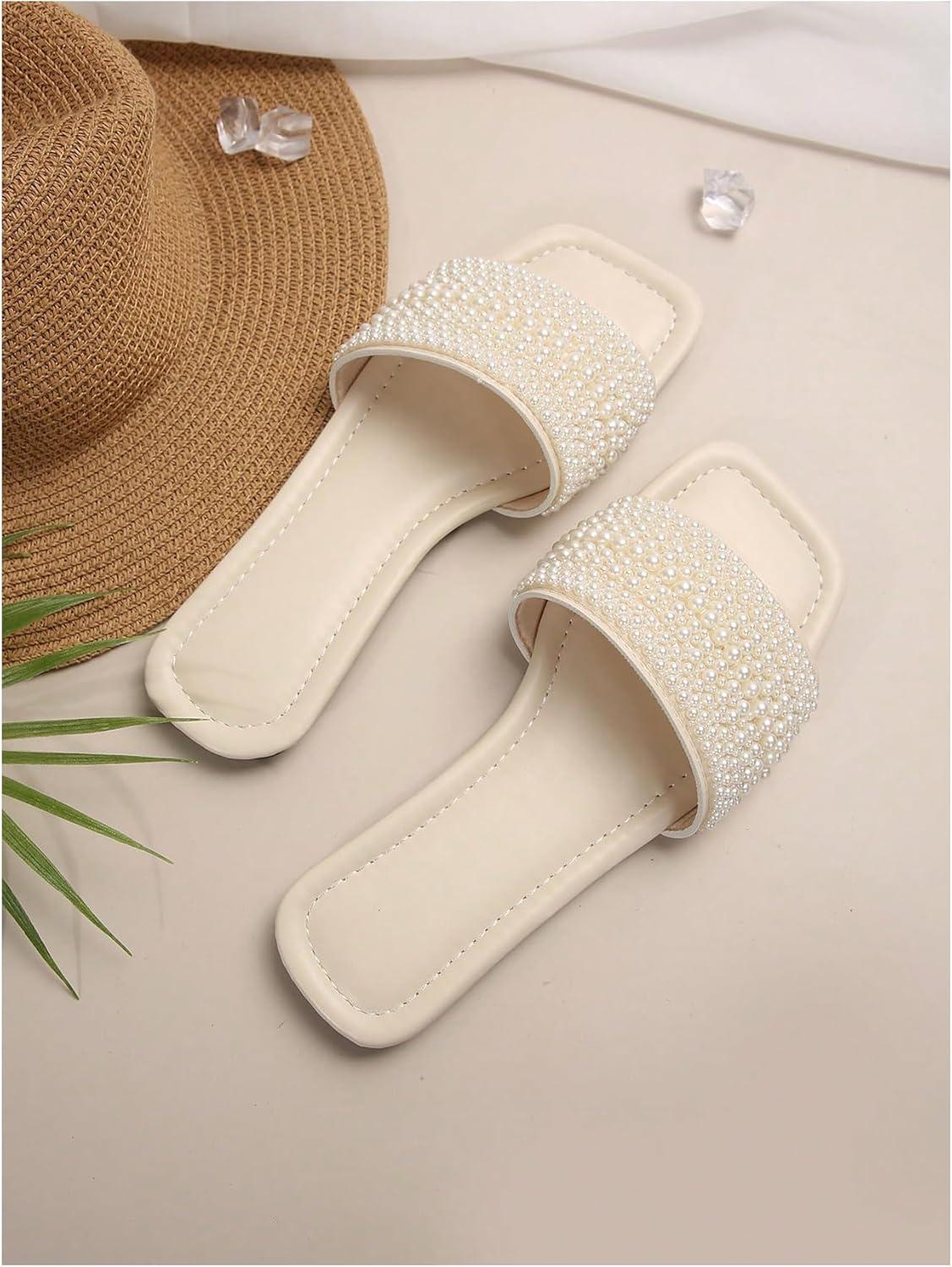 imageOYOANGLE Womens Pearl Decor Square Toe Sandals Leather Open Toe Flat Slip On SlidesBeige