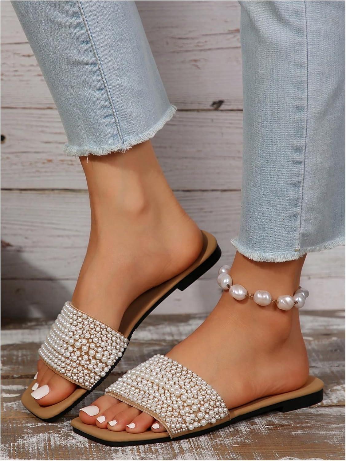 Be the first to review “OYOANGLE Women’s Pearl Decor Square Toe Sandals Leather Open Toe Flat Slip On Slides(Brown)”