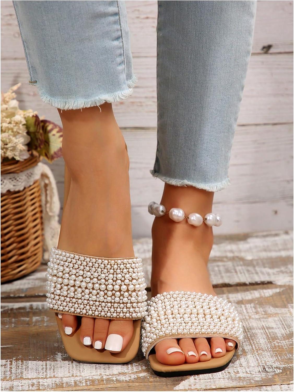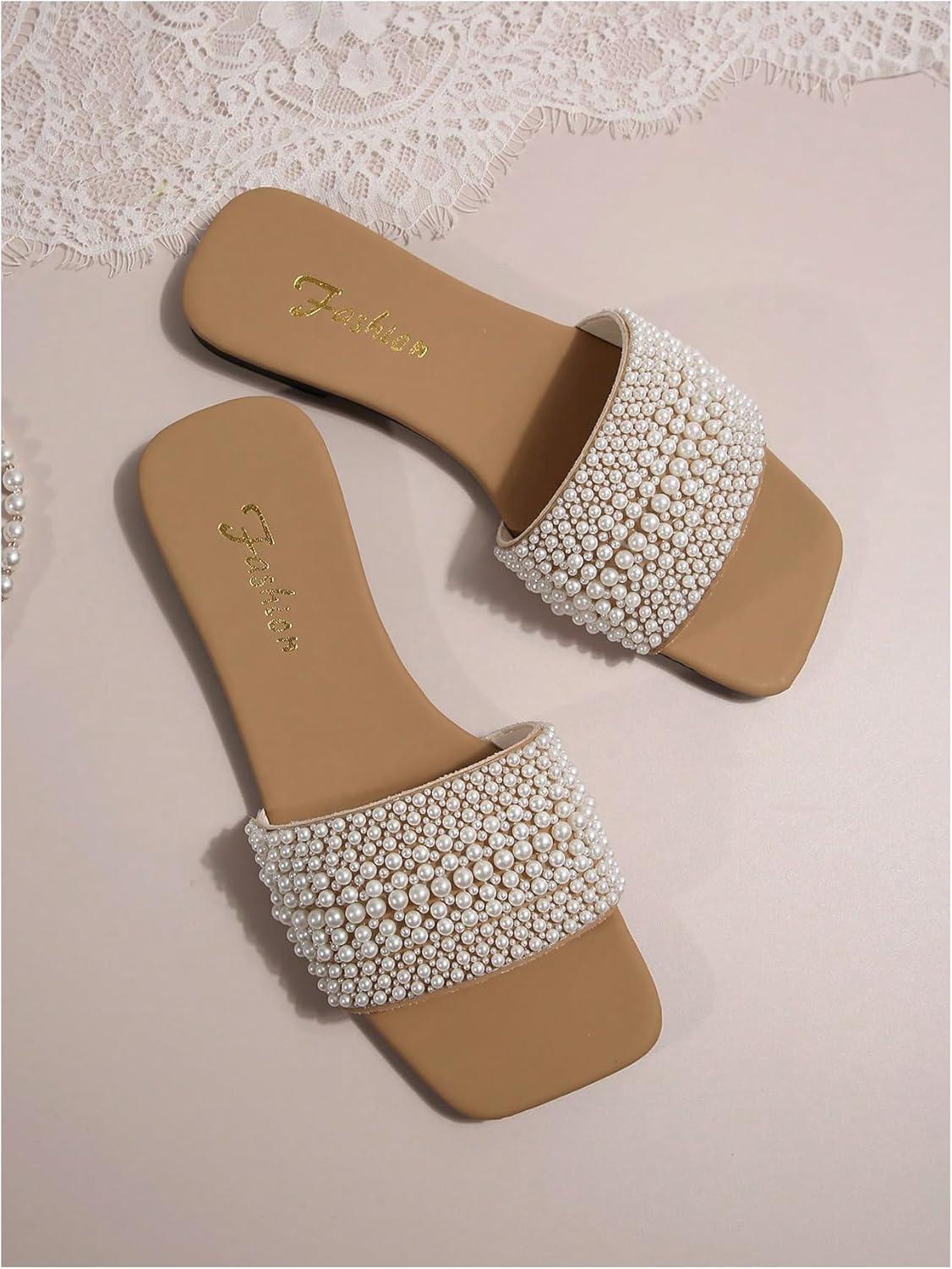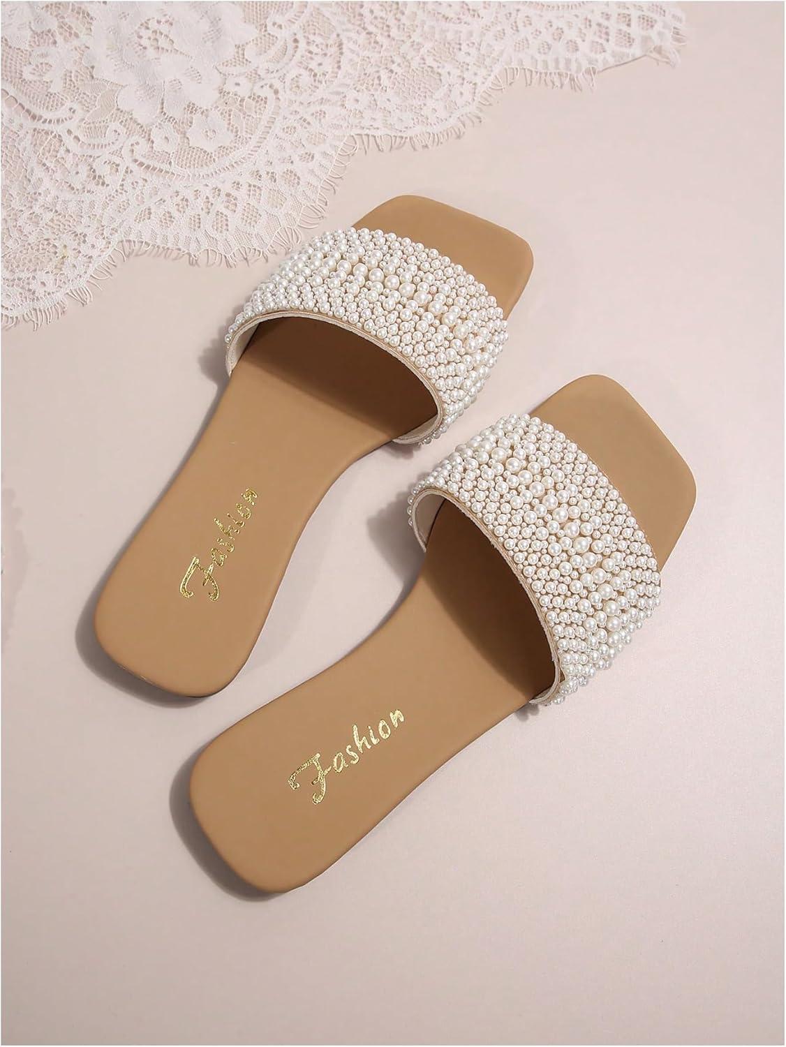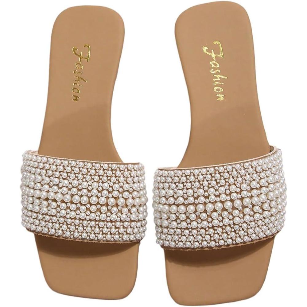 imageOYOANGLE Womens Pearl Decor Square Toe Sandals Leather Open Toe Flat Slip On SlidesWhite