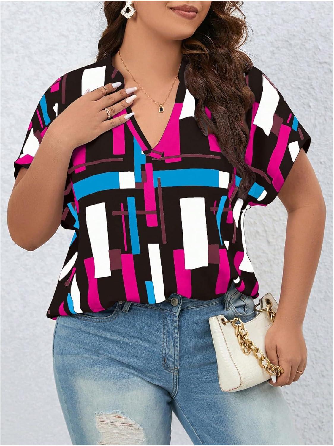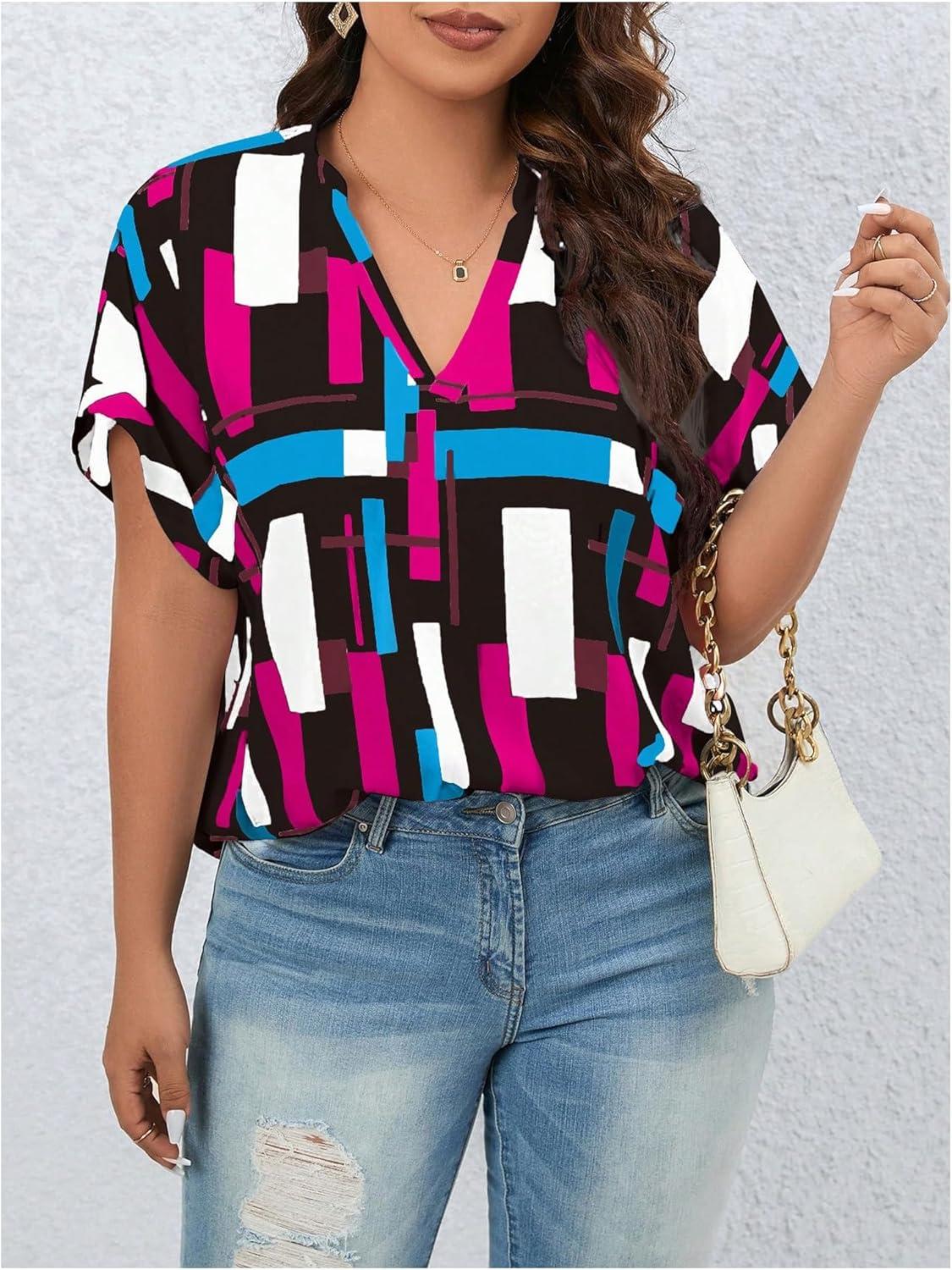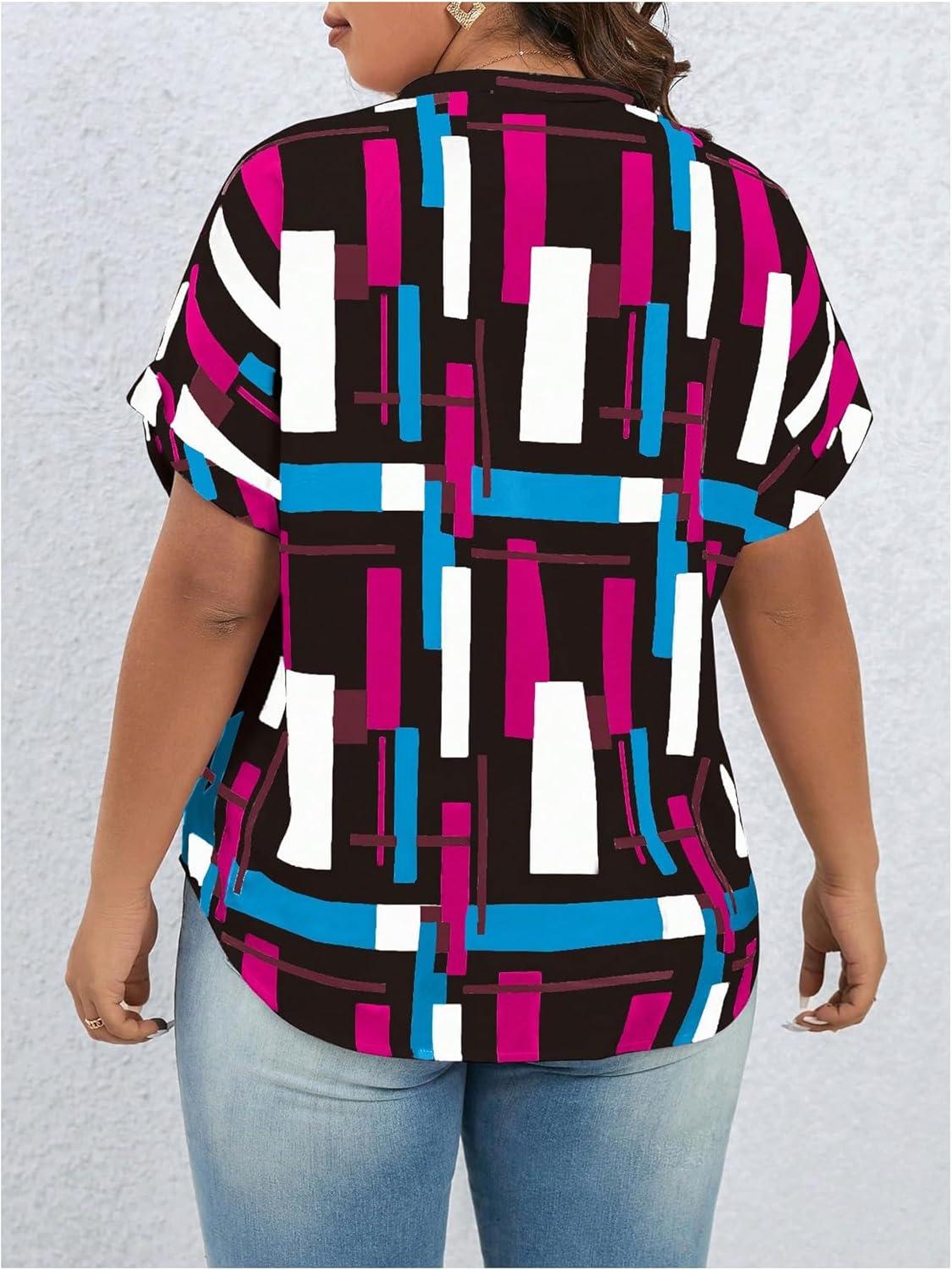 OYOANGLE Women’s Plus Size Blouses Summer Casual Print Short Sleeve V Neck Office Shirt Tops(Pink Blue)