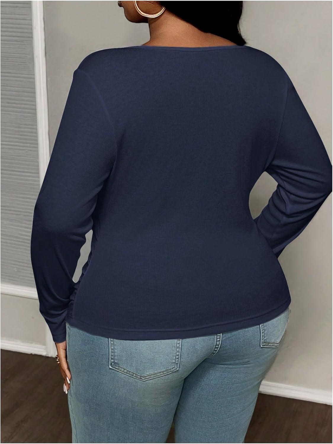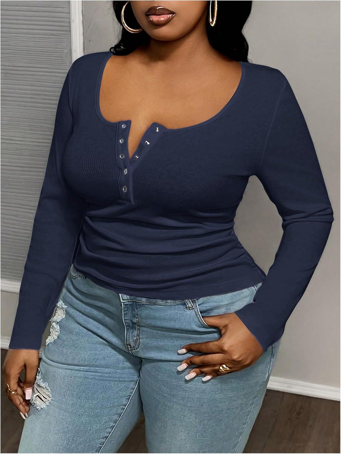 OYOANGLE Women’s Plus Size Long Sleeve Henley Shirts Button Front Ribbed Knit Fitted T-Shirt Fall Tops(Deep Blue)