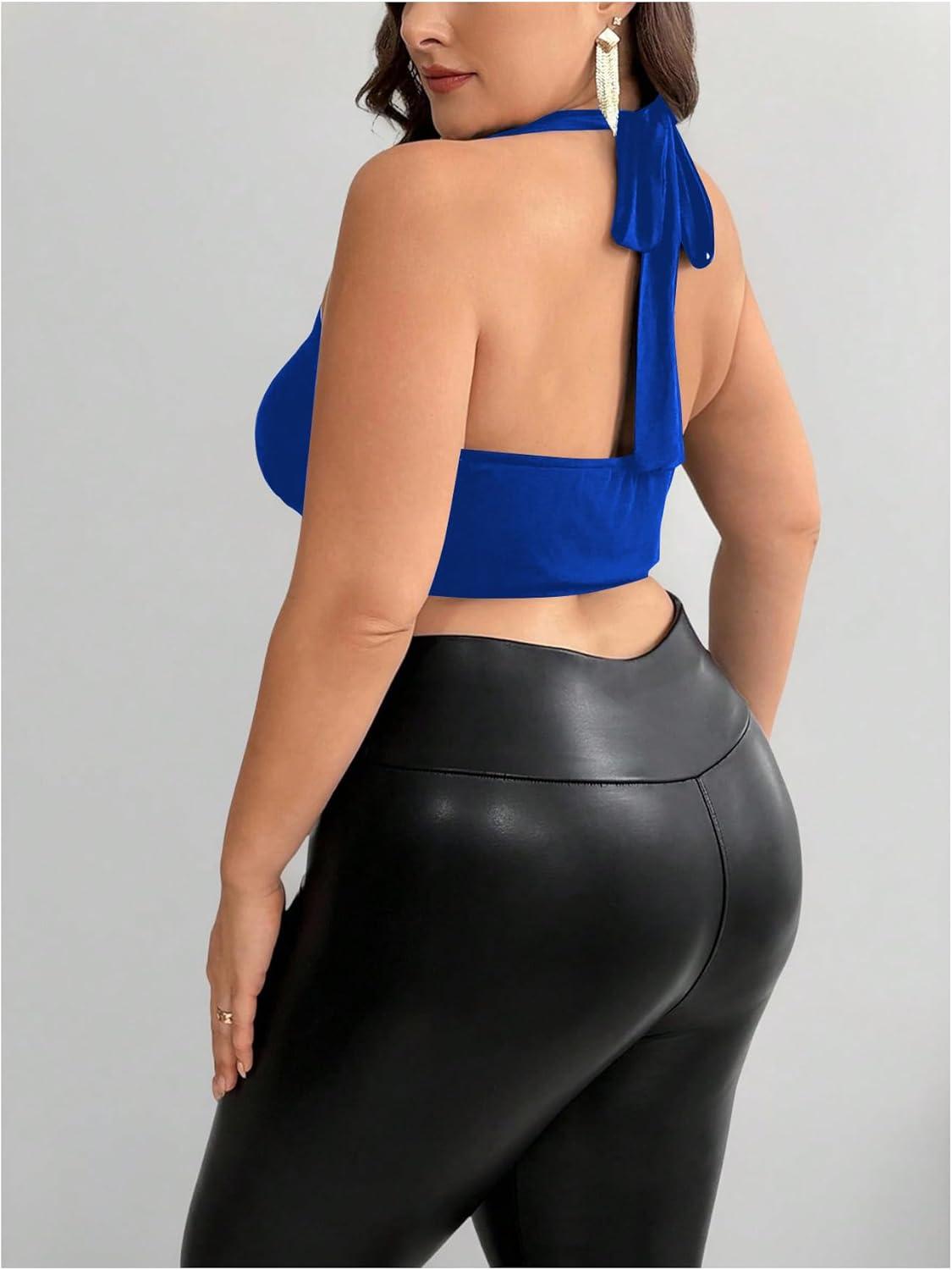 OYOANGLE Women's Plus Size Metal Ring Linked Plunge Neck Halter Crop Top Open Back Ruched Party Tops(Royal Blue)
