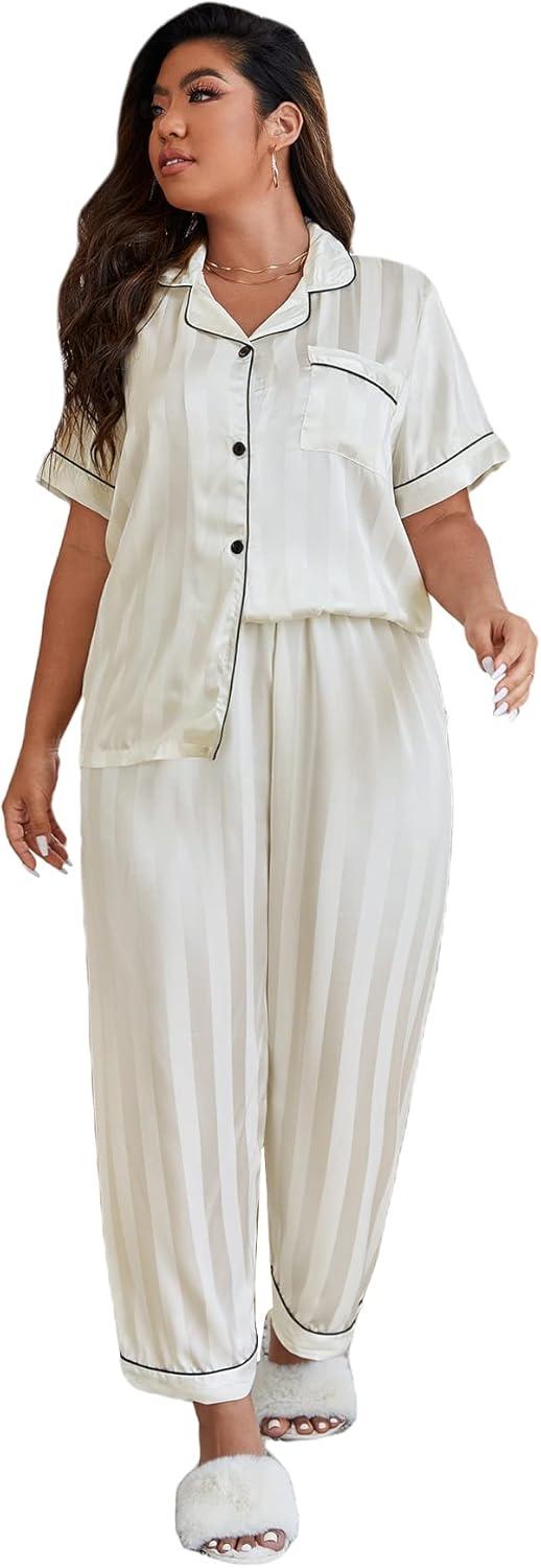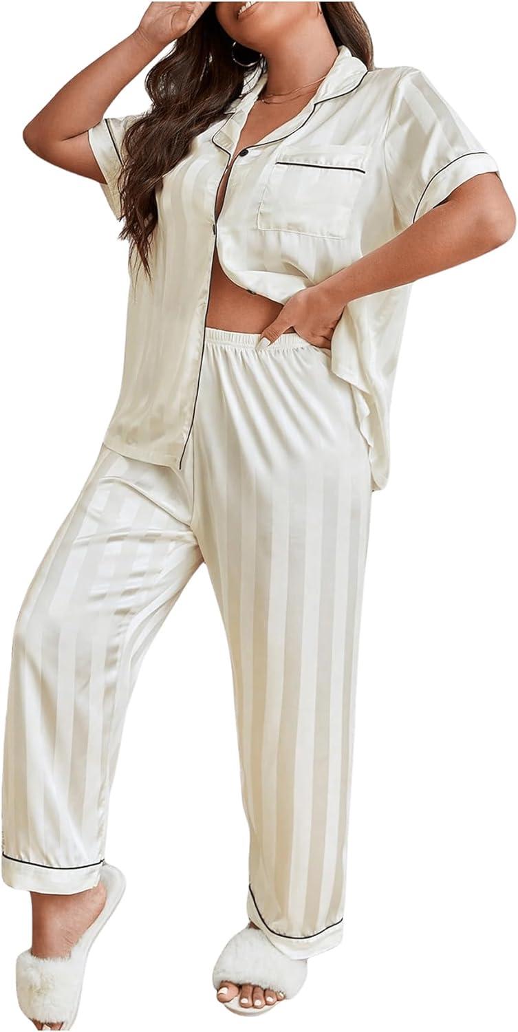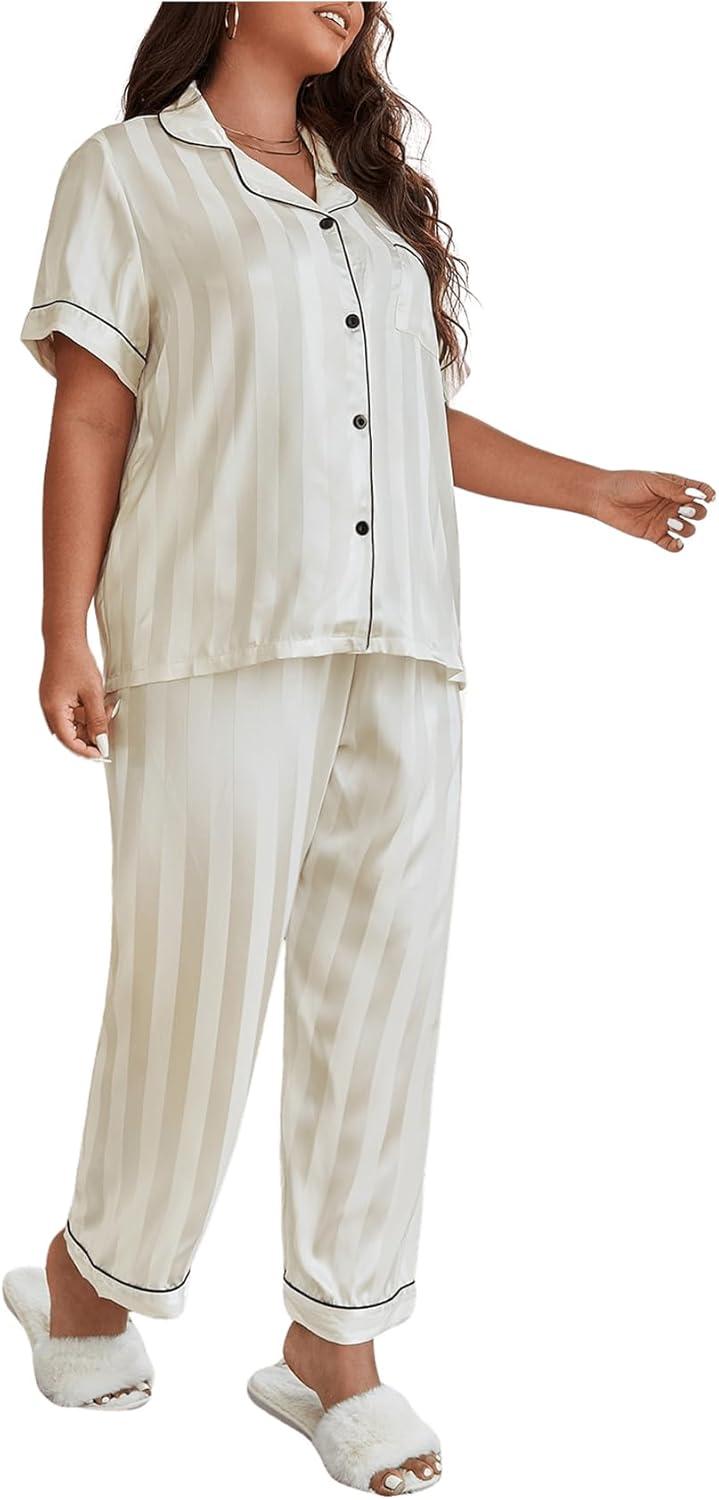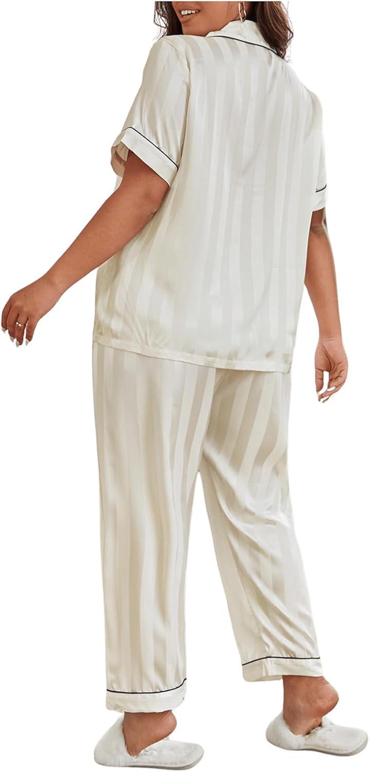 OYOANGLE Women's Plus Size Satin Pajama Set Silky Short Sleeve Button Down Tops and Pants Sleepwear Loungewear(White)