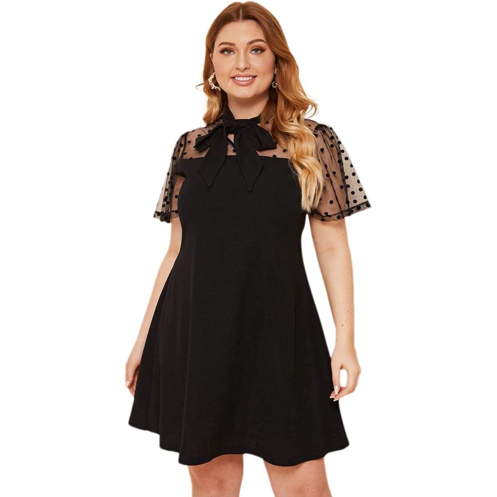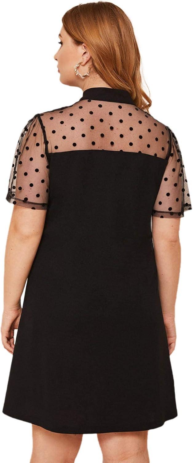 OYOANGLE Women’s Plus Size Short Sleeve Dress Contrast Mesh Bow Tie Neck A-Line Party Dress(Black)