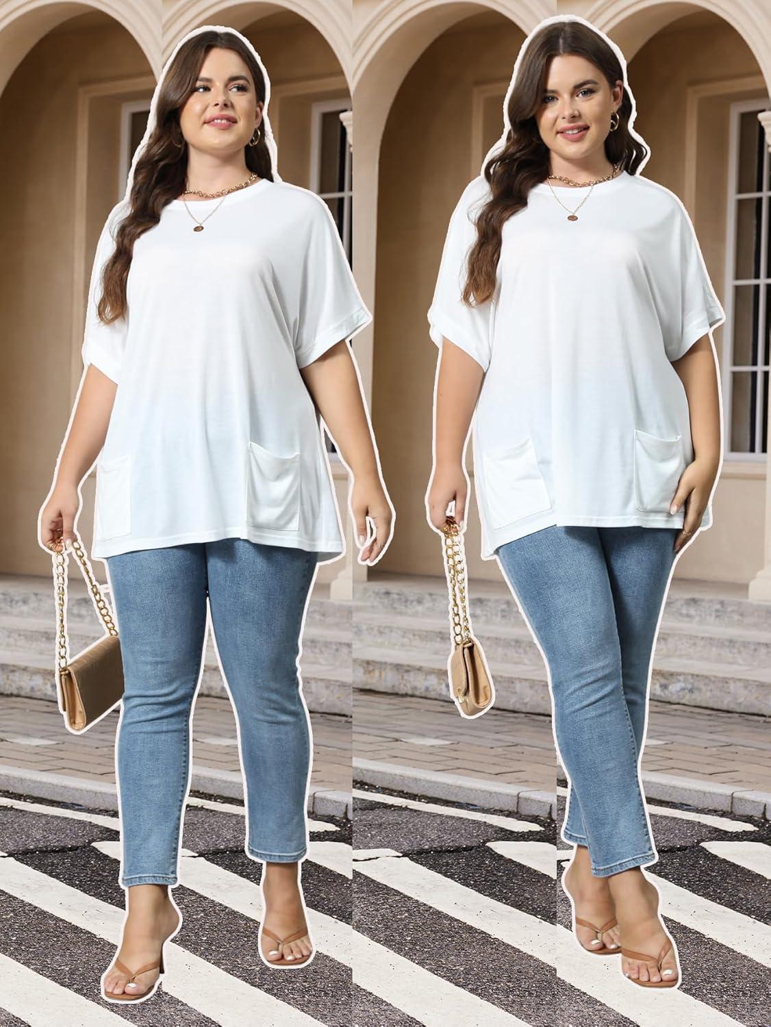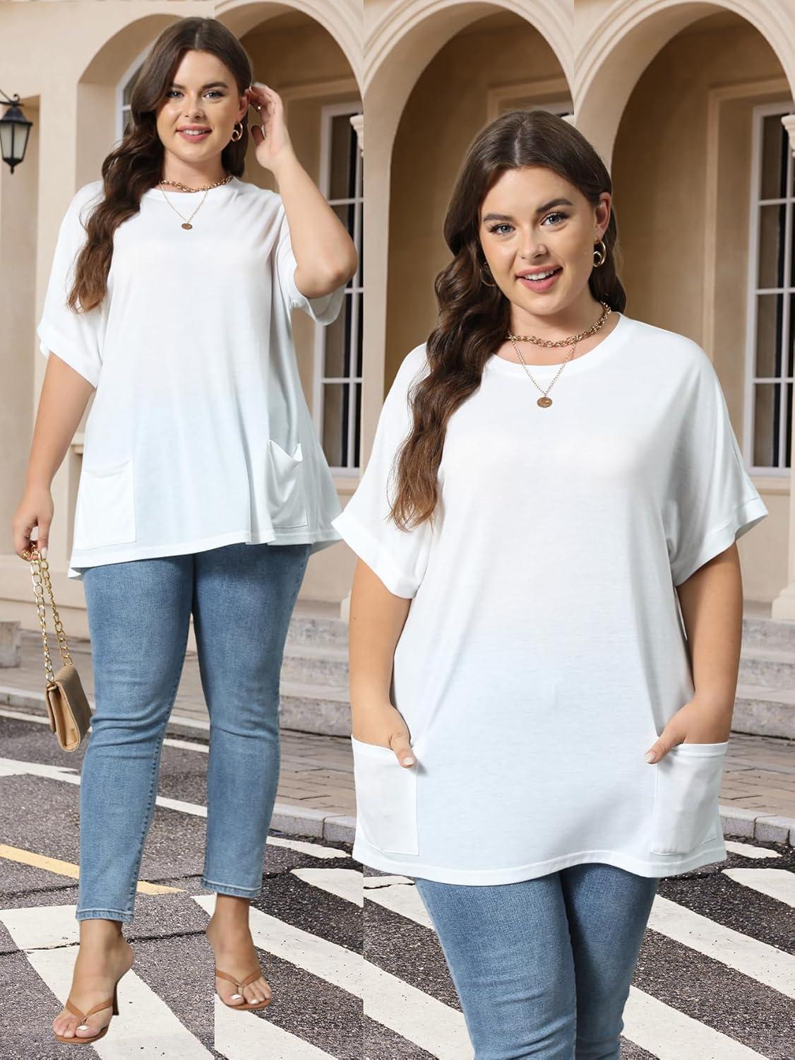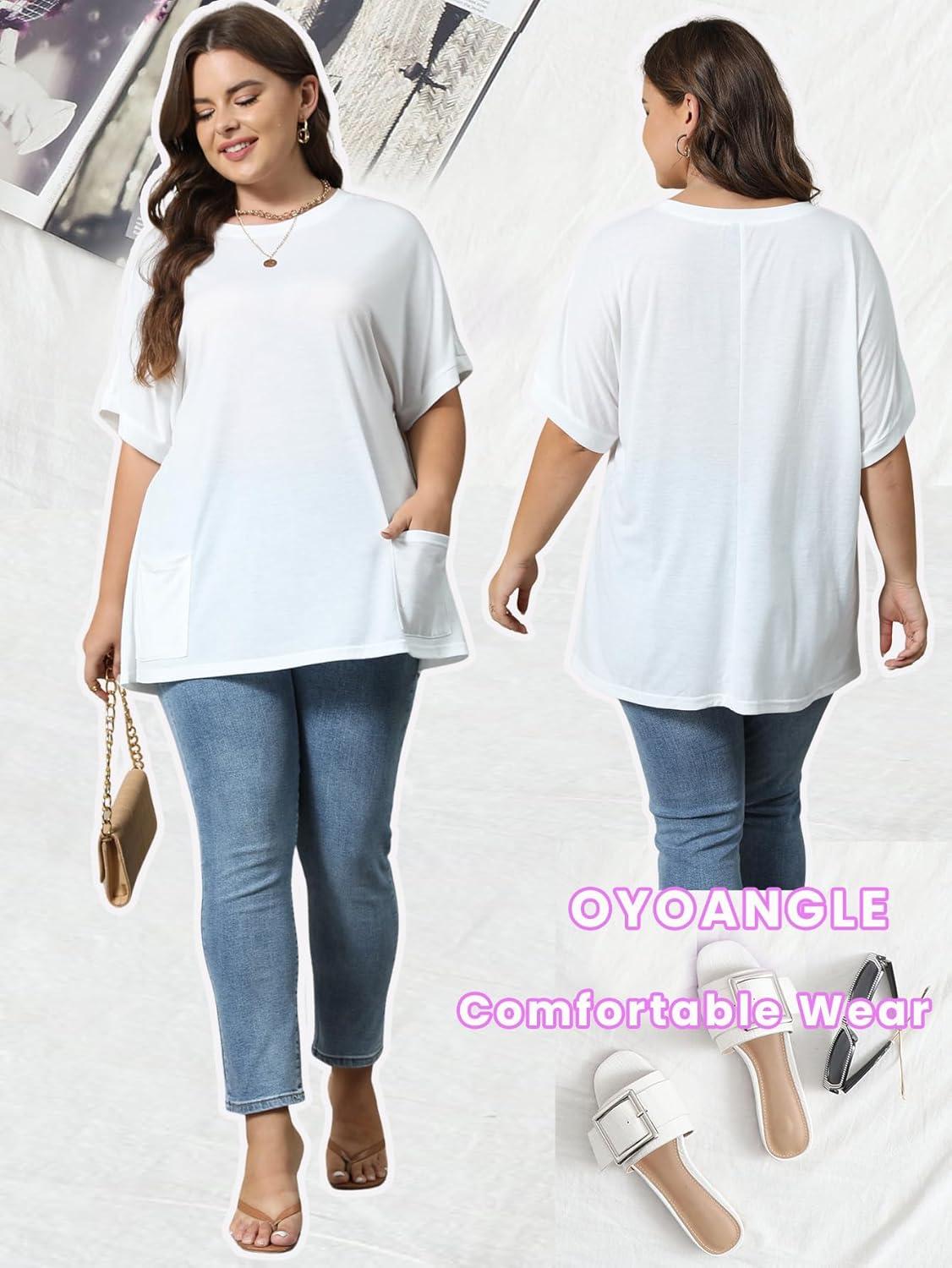 OYOANGLE Women's Plus Size Short Sleeve Round Neck Pocket Tee Shirt Basic Solid Loose Tunic Tops(White)