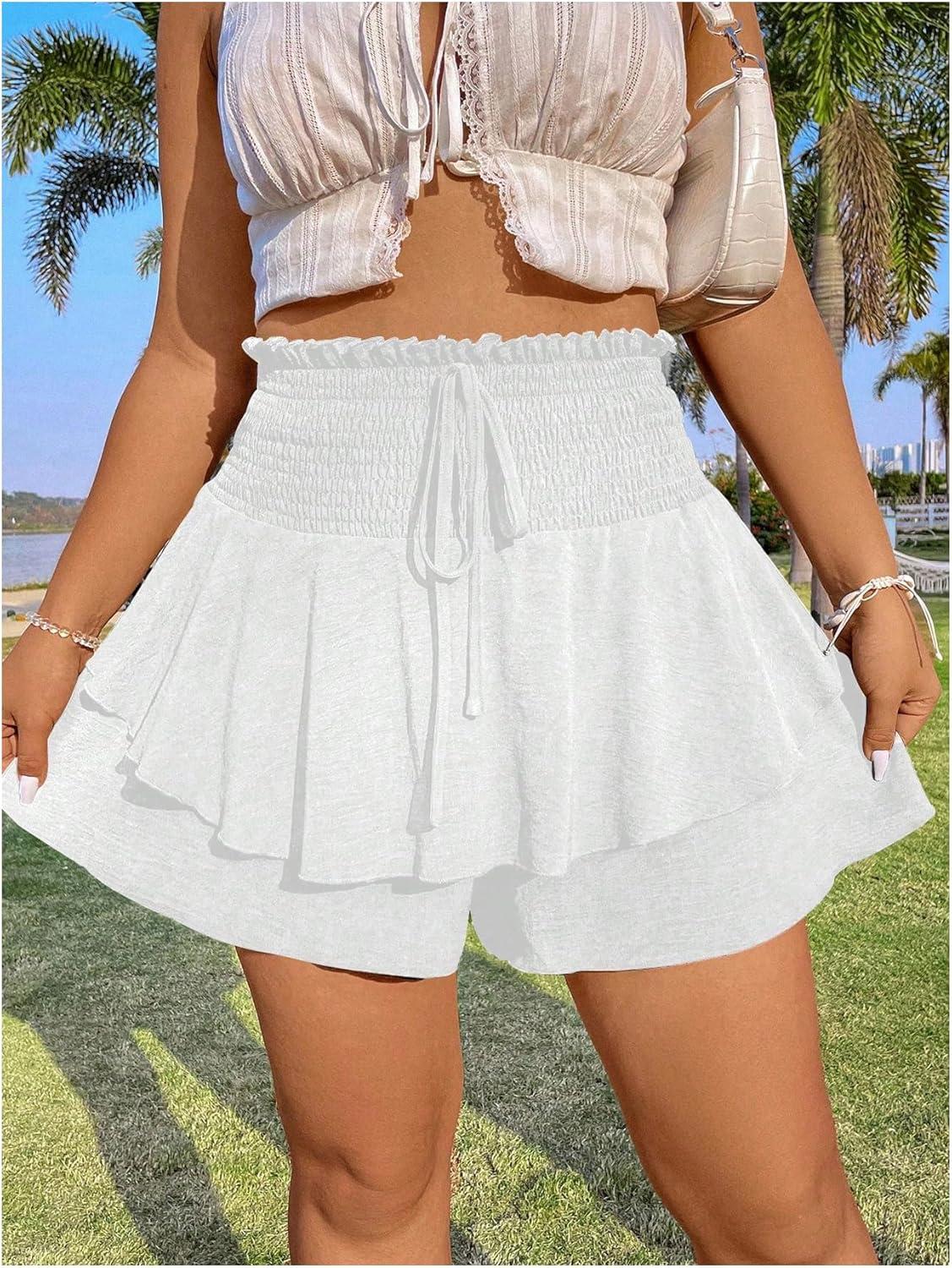 OYOANGLE Women’s Plus Size Smocked Tiered Ruffle Flowy Shorts Drawstring Elastic Waist Wide Leg Shorts(White)