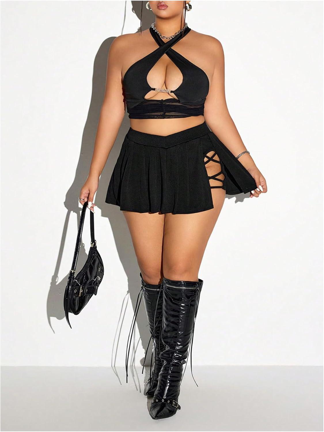 imageOYOANGLE Womens Plus Size Split Side Pleated Mini Skirts High Waist Flared A Line Short SkirtsBlack