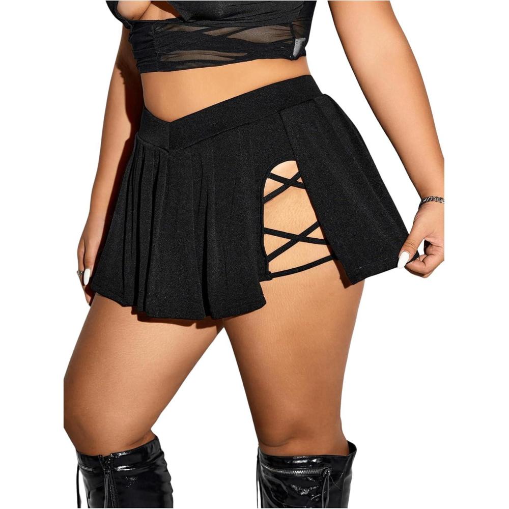 OYOANGLE Women’s Plus Size Split Side Pleated Mini Skirts High Waist Flared A Line Short Skirts(Black)