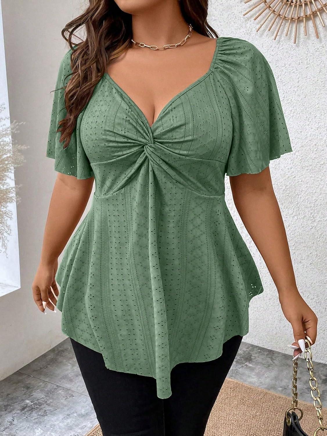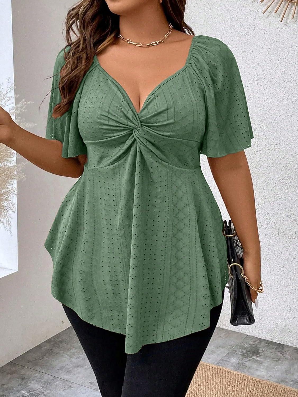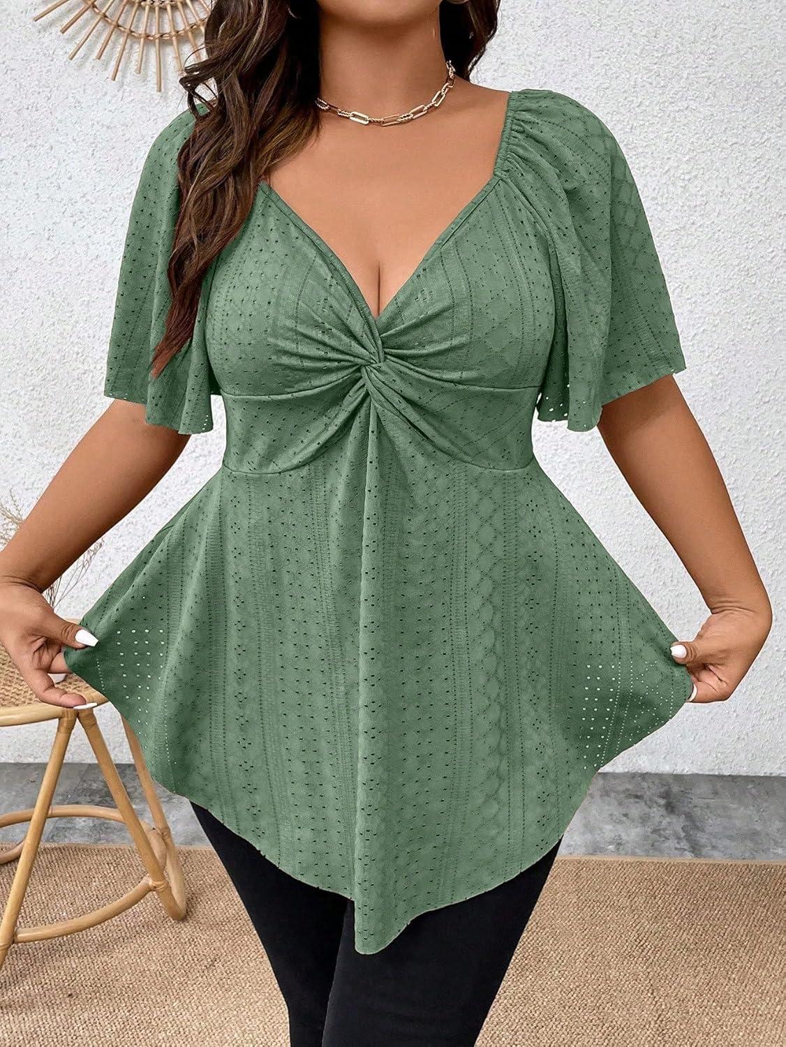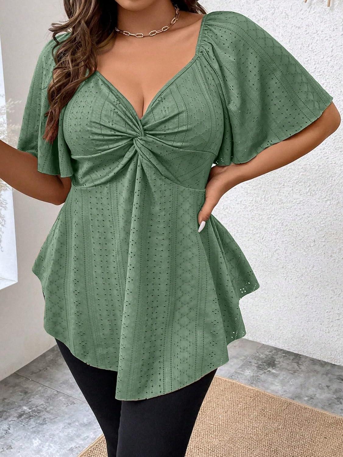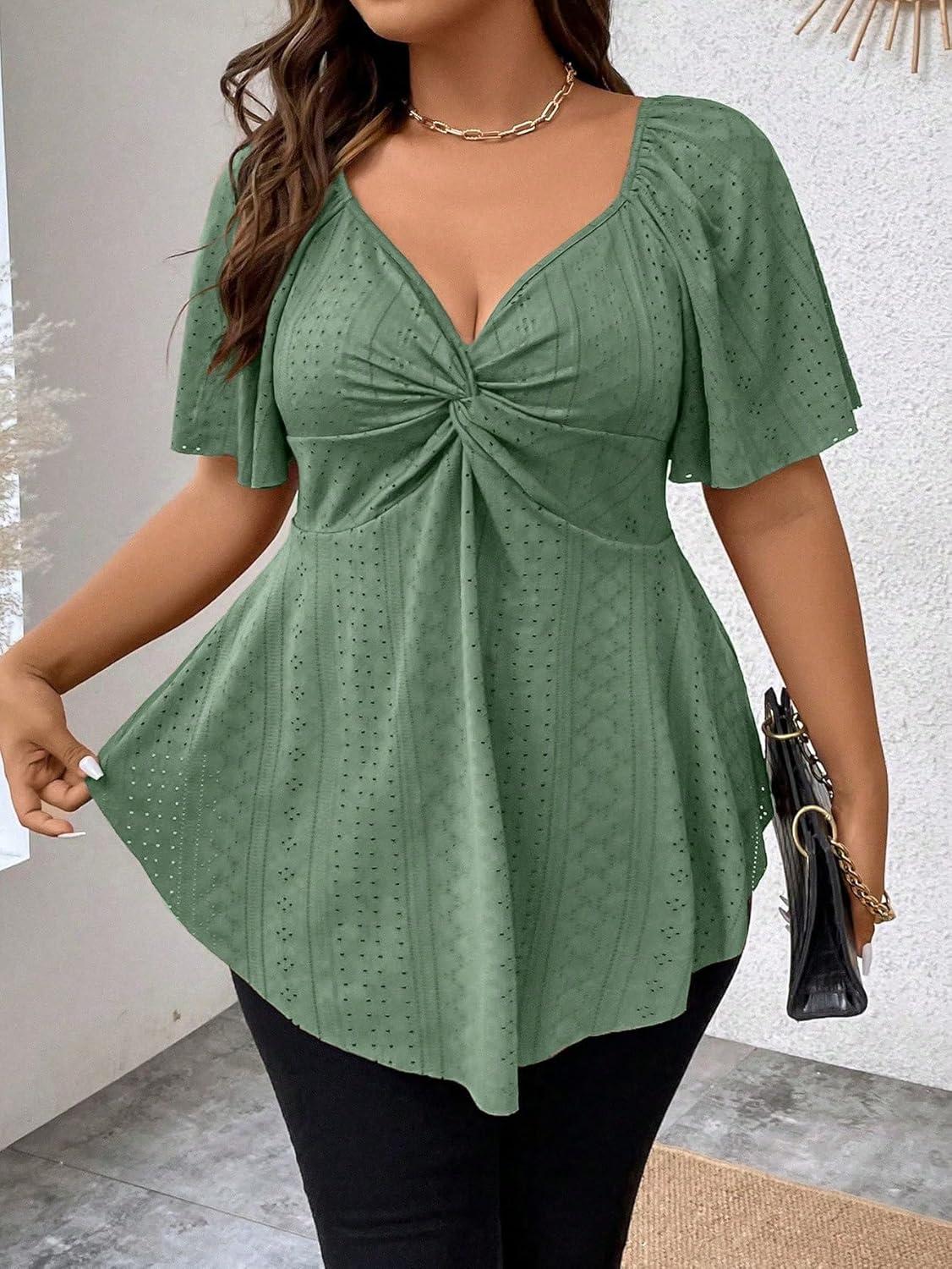 OYOANGLE Women's Plus Size Twist Front Short Sleeve Sweetheart Neck Asymmetrical Hem Blouses Solid Peplum Tops(Army Green)