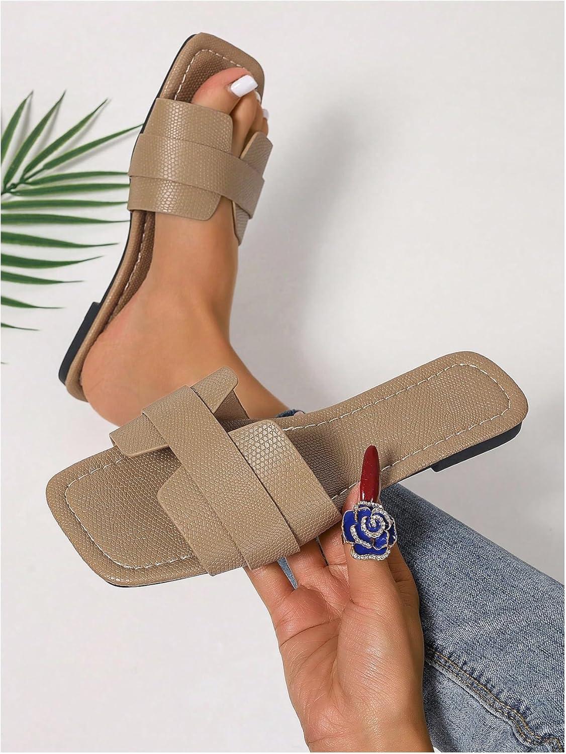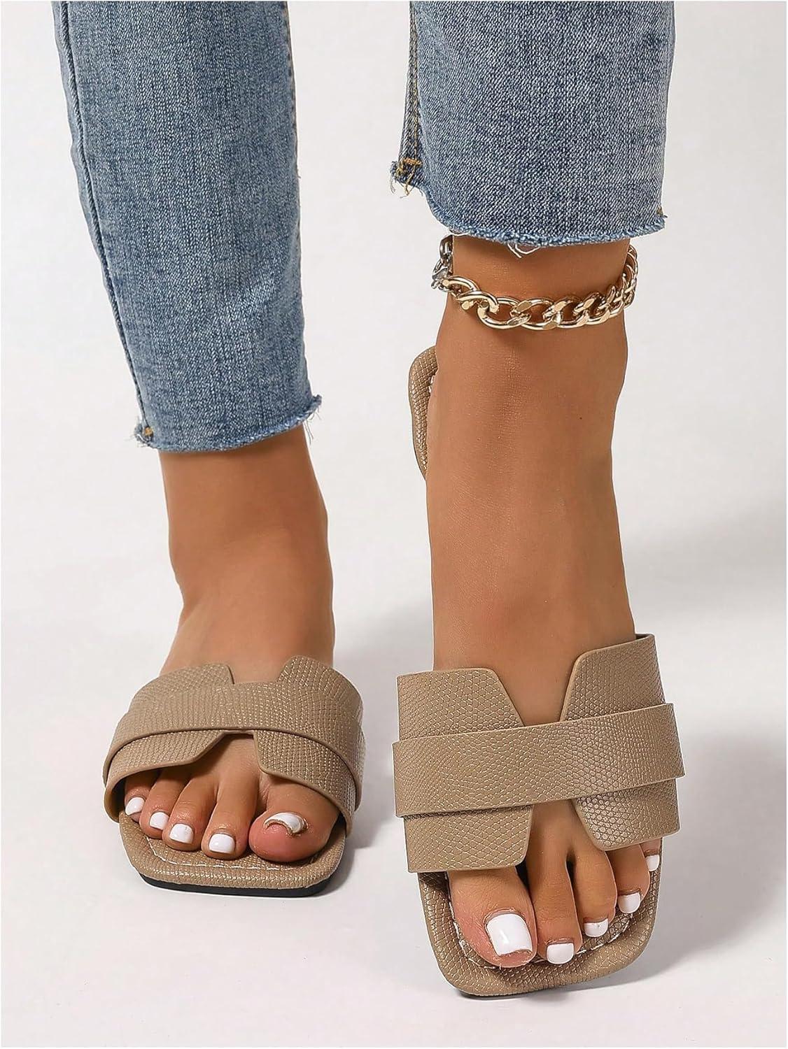 OYOANGLE Women's PU Leather Dressy Flat Sandals Square Open Toe Slip on Summer Slide Shoes(Apricot)