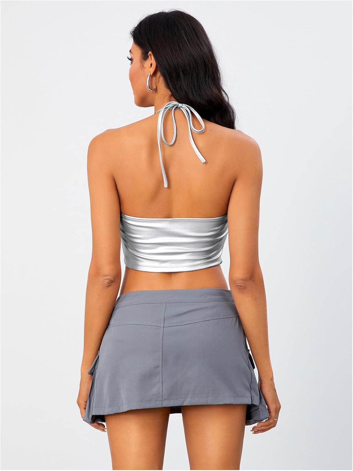 OYOANGLE Women’s PU Leather Going Out Top Summer Sleeveless Draped Halter Crop Tank Cami Top(Light Silver)