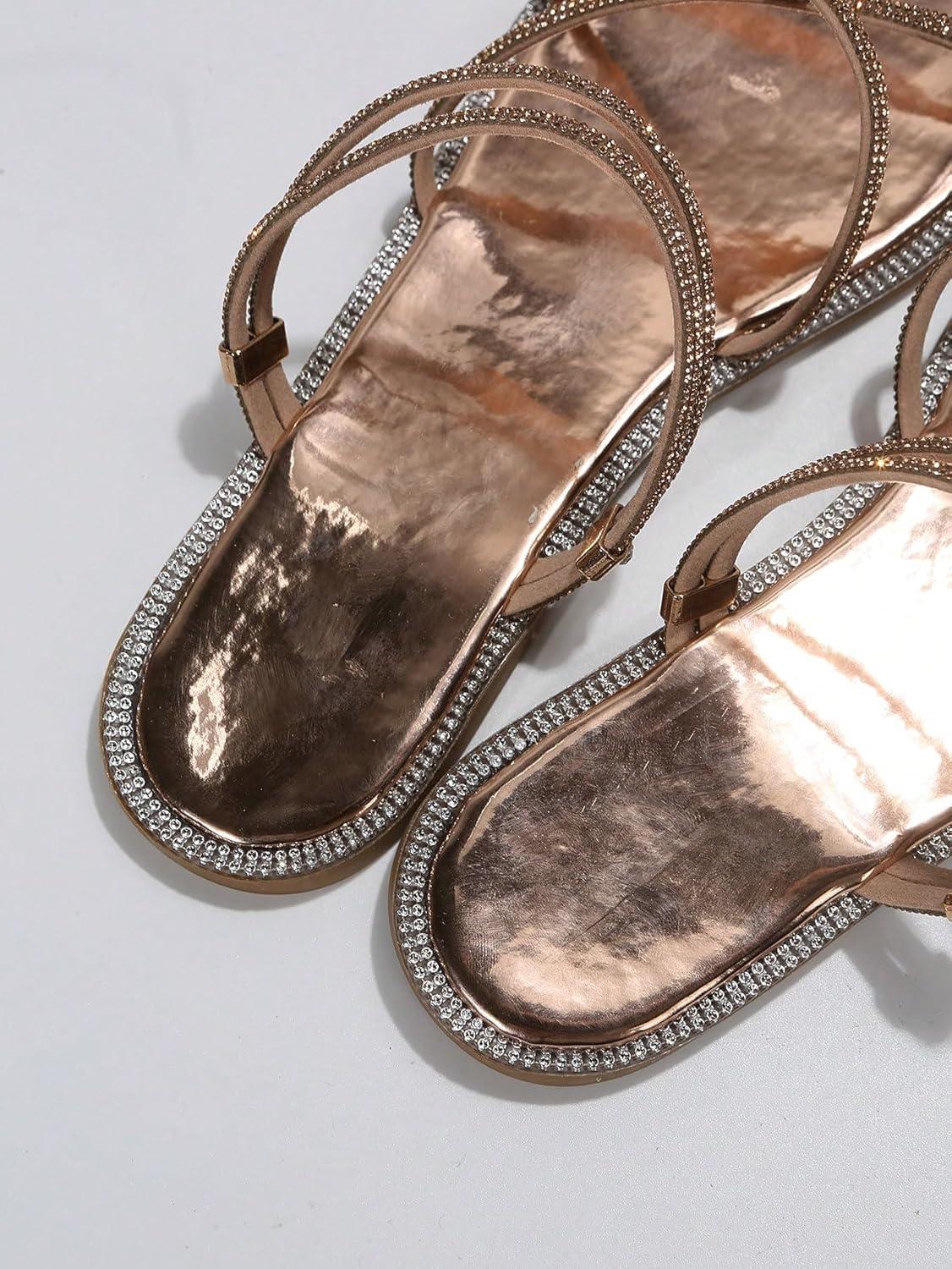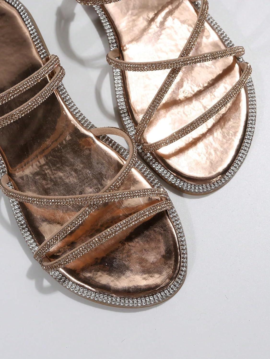 OYOANGLE Women’s Rhinestone Strappy Open Toe Slide Sandals Slip on Casual Flat Sandals(Champagne Brown)