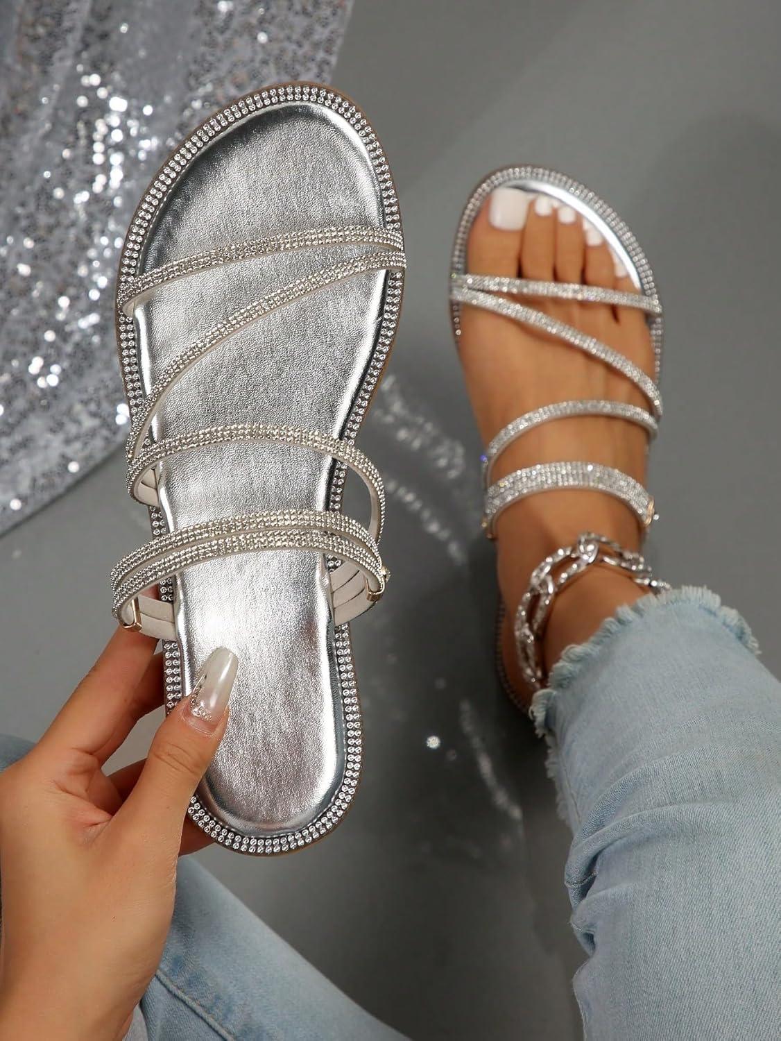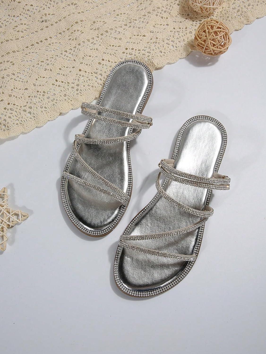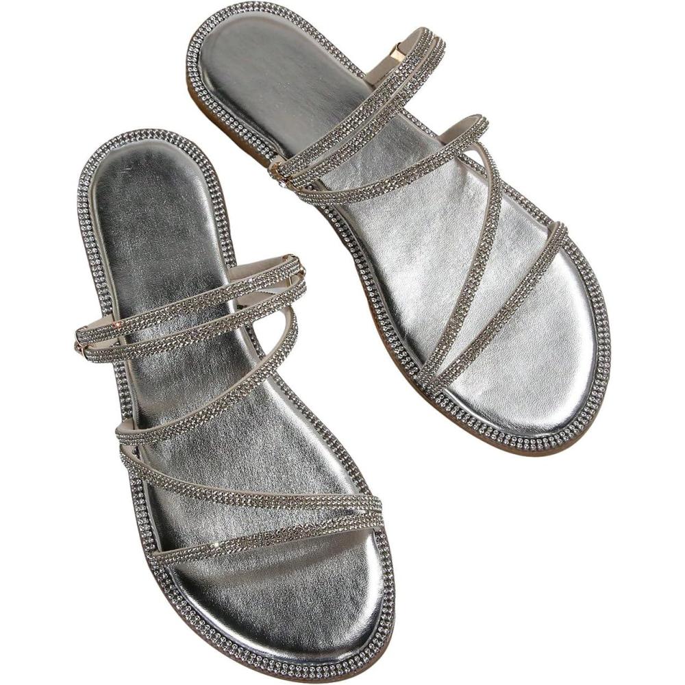 OYOANGLE Women's Rhinestone Strappy Open Toe Slide Sandals Slip on Casual Flat Sandals(Silver)