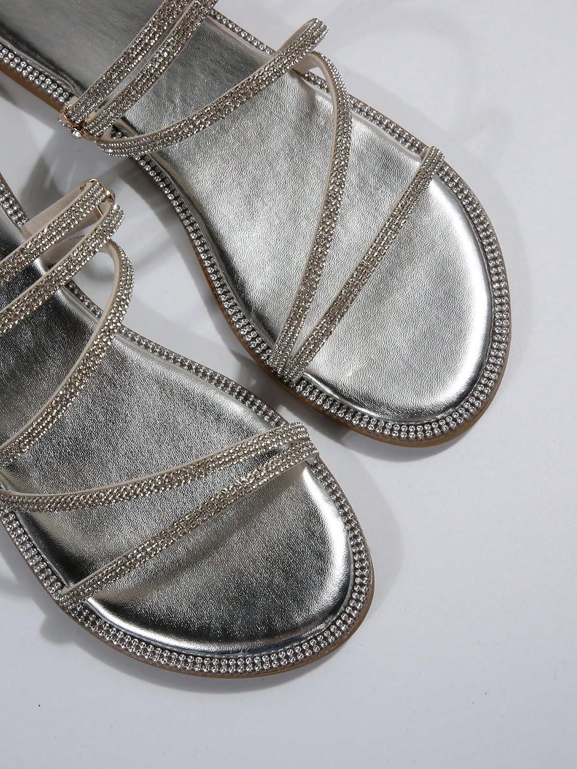 OYOANGLE Women’s Rhinestone Strappy Open Toe Slide Sandals Slip on Casual Flat Sandals(Silver)