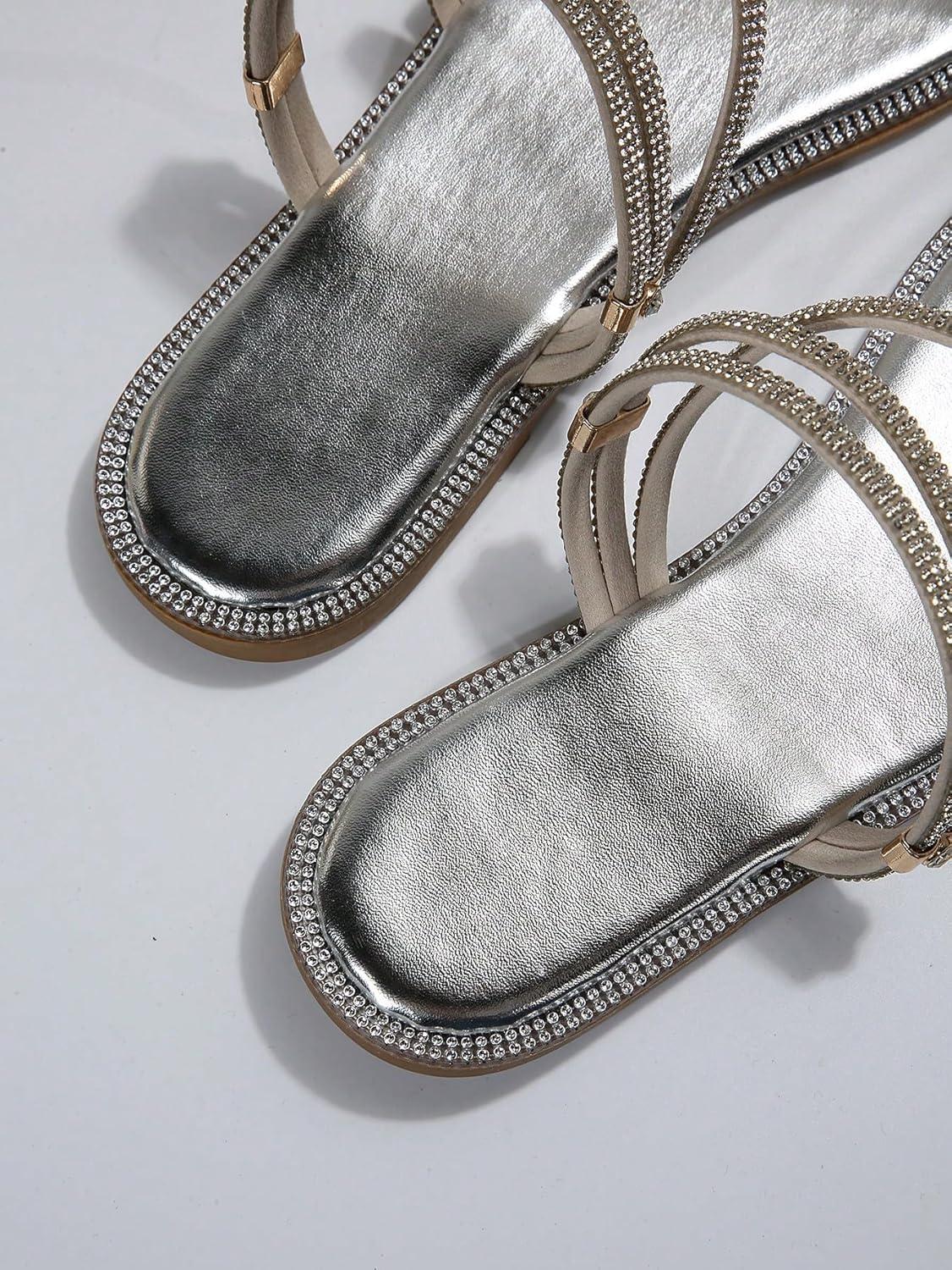 imageOYOANGLE Womens Rhinestone Decor Strappy Flat Sandals Glitter Thin Straps Open Toe Slip on Dressy SlidesBlack