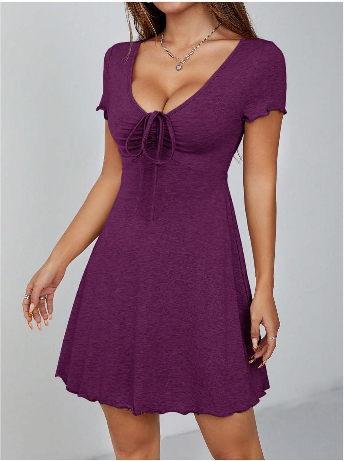 OYOANGLE Women's Short Sleeve Drawstring Front Ruched Short Dress V Neck A Line Tshirt Dresses(Purple)