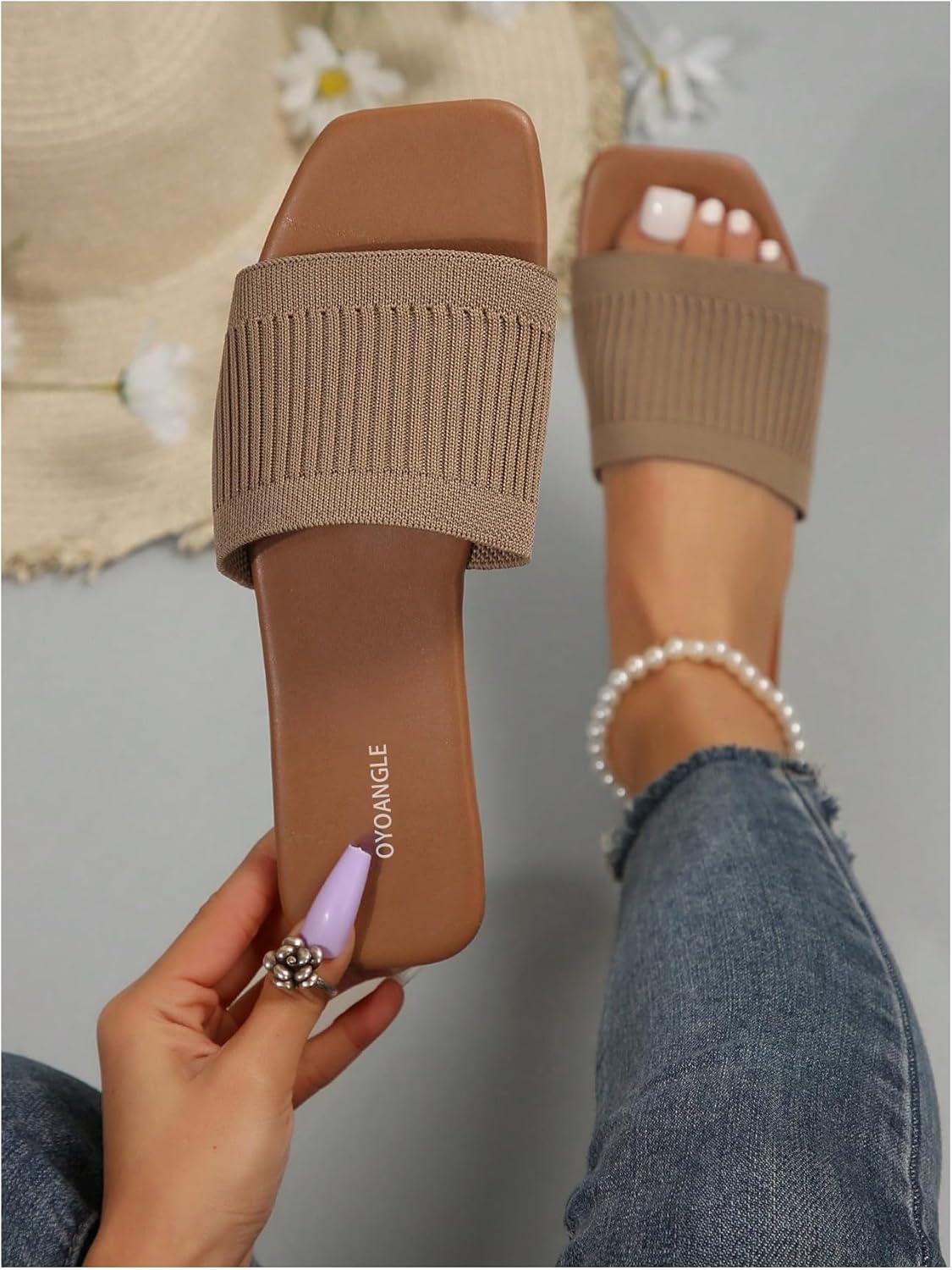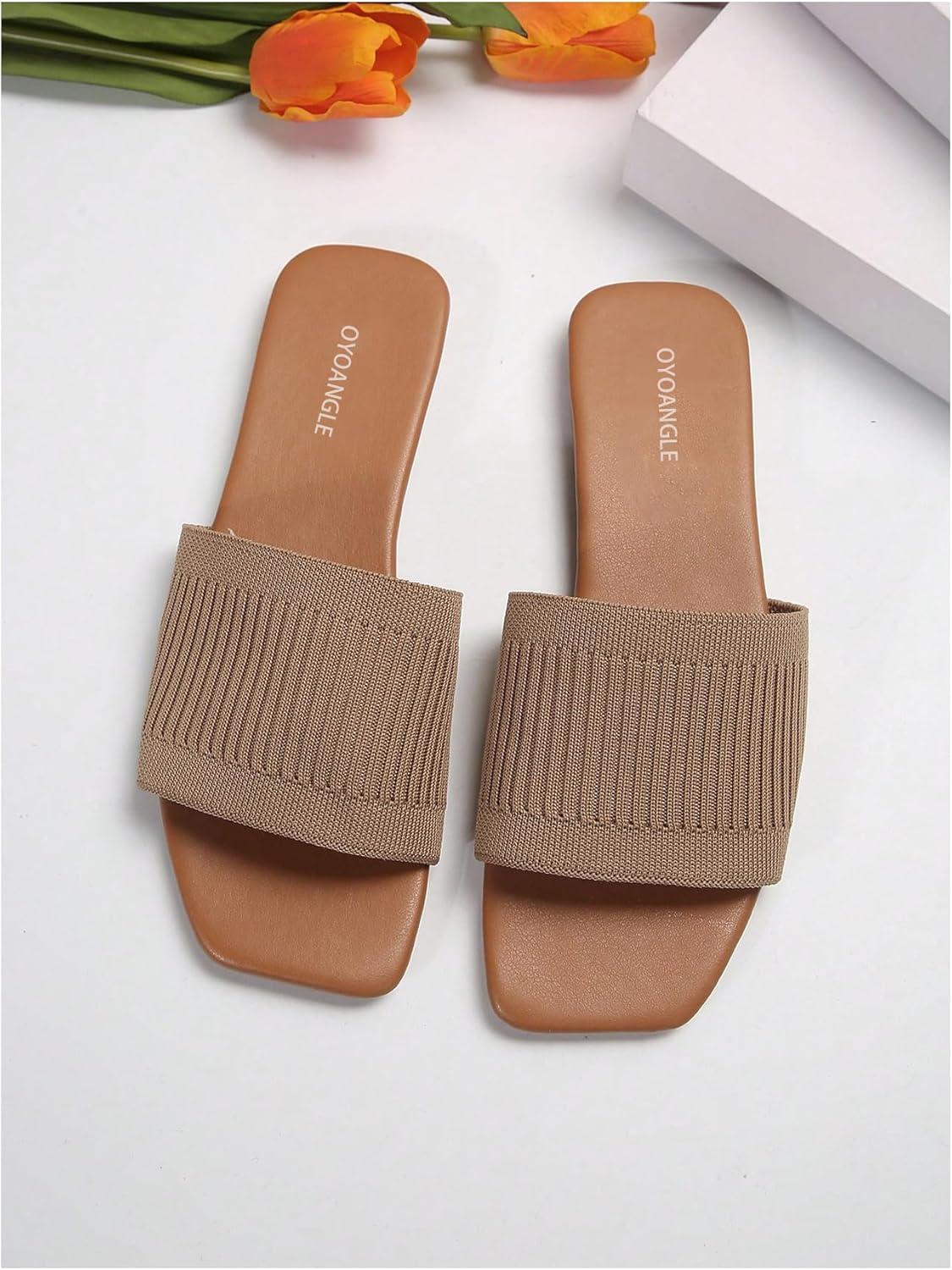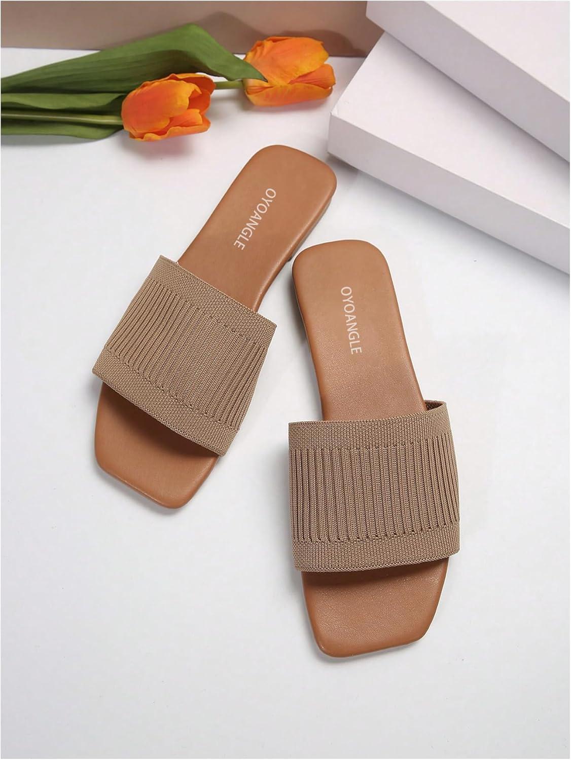 OYOANGLE Women's Single Band Square Open Toe Slide Sandals Summer Slip on Flat Sandals(Khaki)