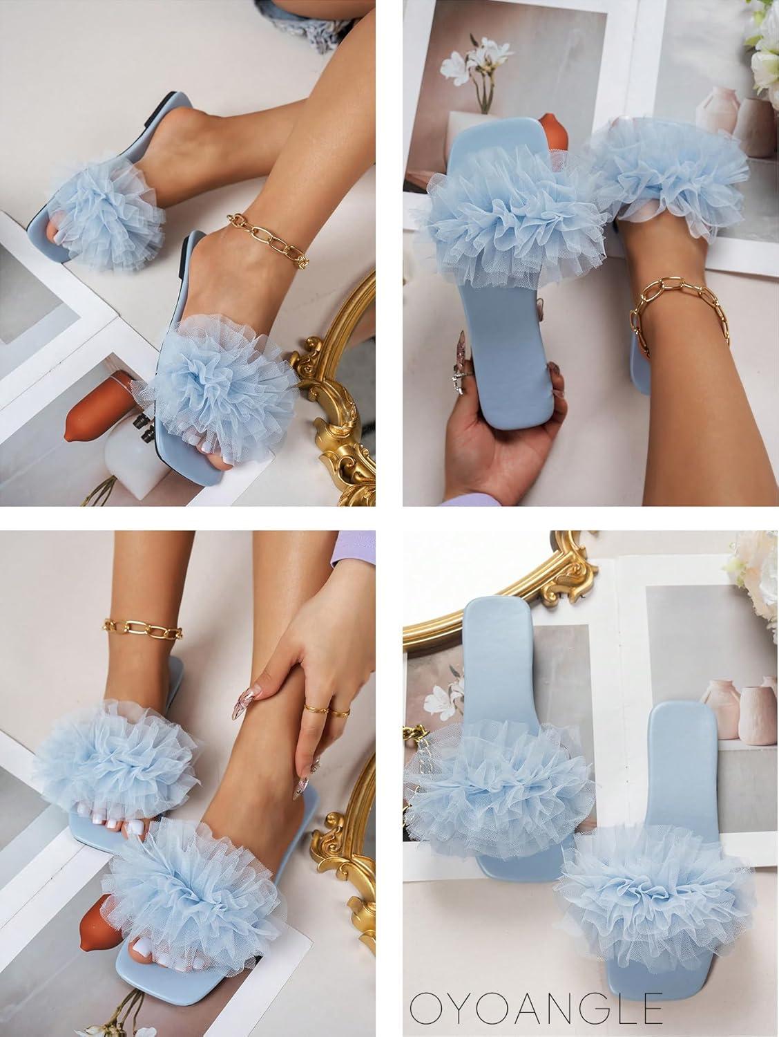 imageOYOANGLE Womens Square Open Toe Slide Sandals Sheer Ruffle Dressy Slip on Flat SandalBlue
