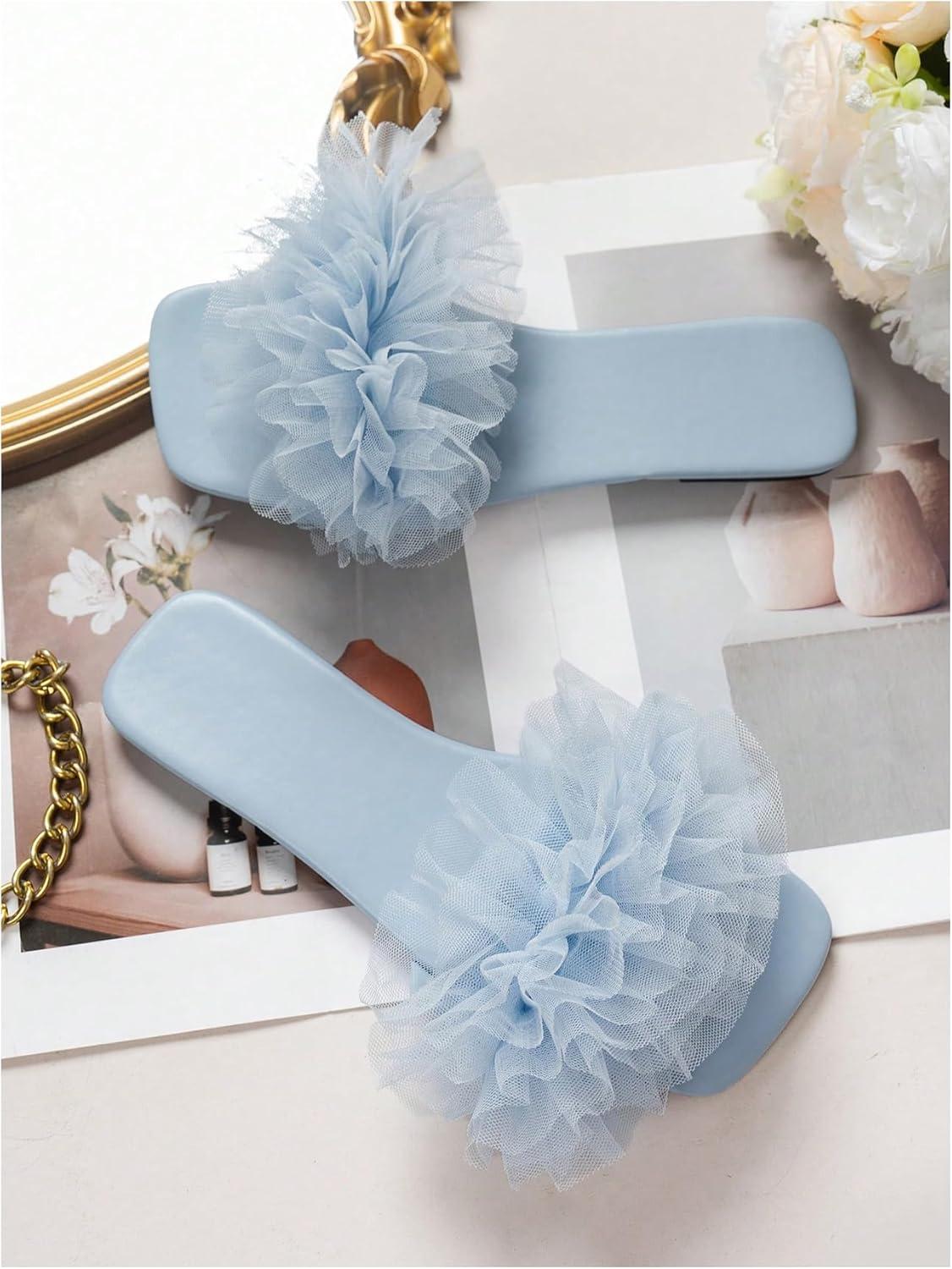 OYOANGLE Women's Square Open Toe Slide Sandals Sheer Ruffle Dressy Slip on Flat Sandal(Blue)