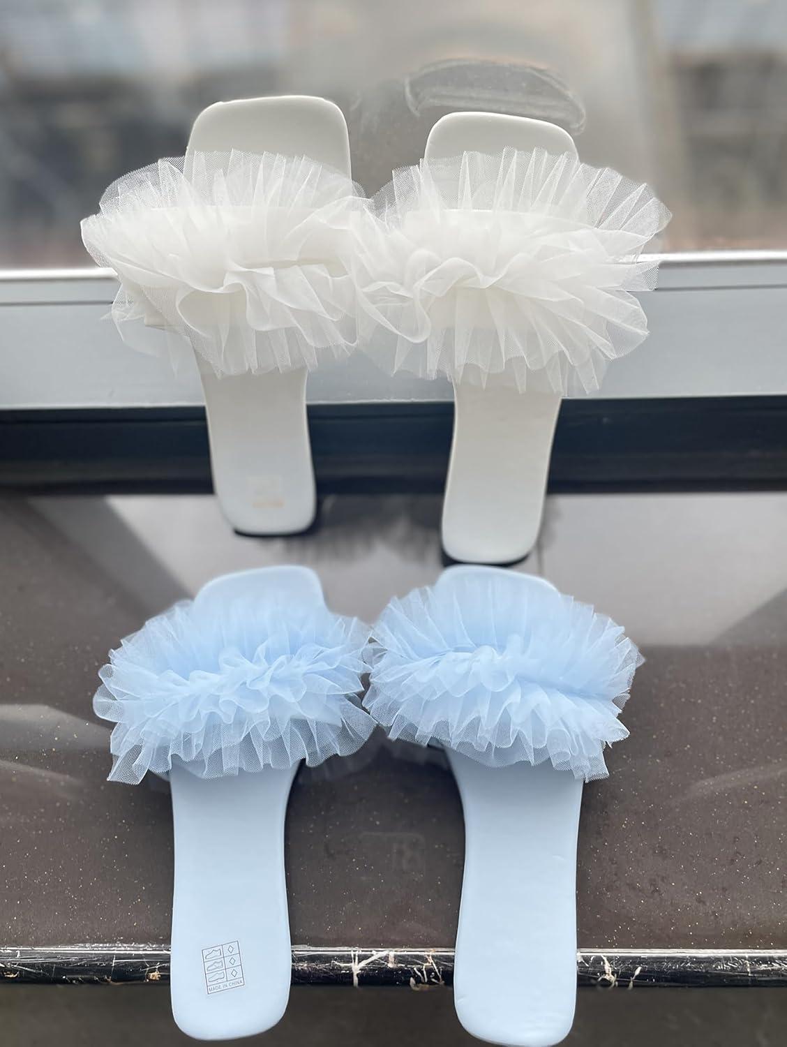 OYOANGLE Women’s Square Open Toe Slide Sandals Sheer Ruffle Dressy Slip on Flat Sandal(White)