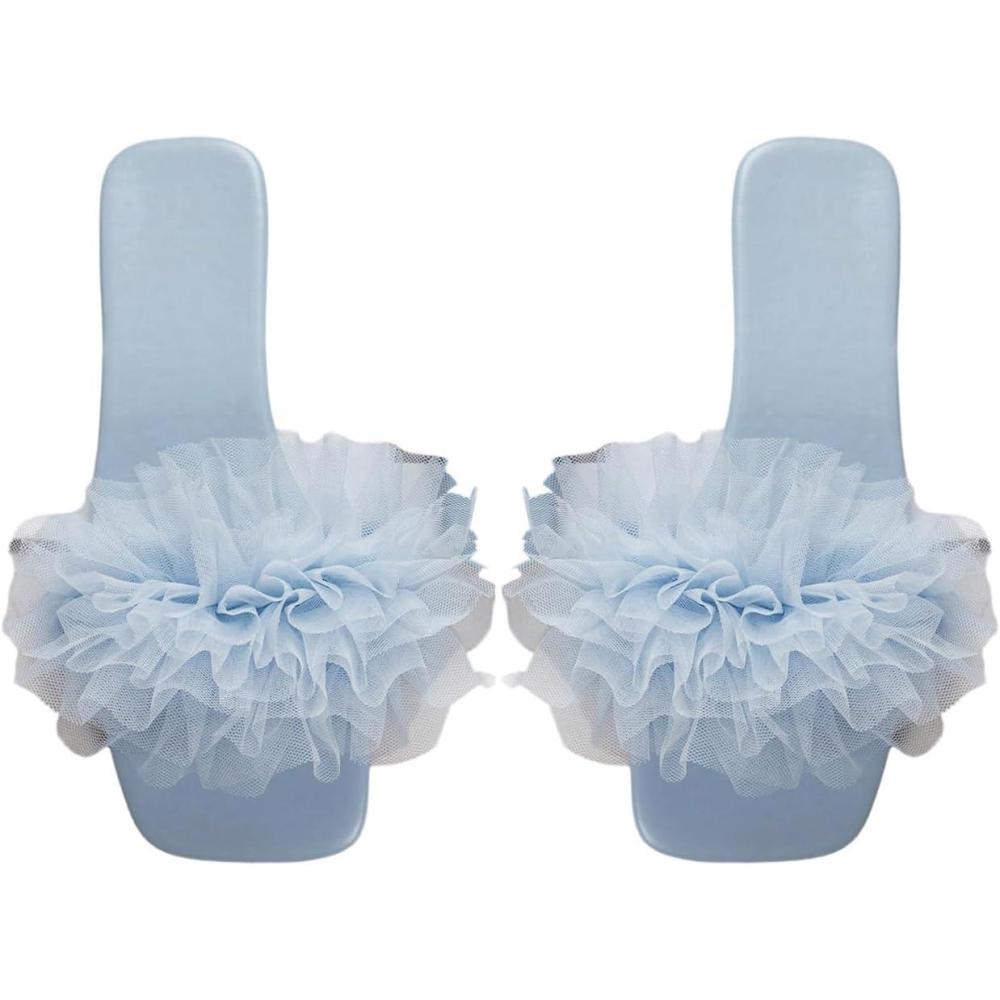 OYOANGLE Women’s Square Open Toe Slide Sandals Sheer Ruffle Dressy Slip on Flat Sandal(Blue)