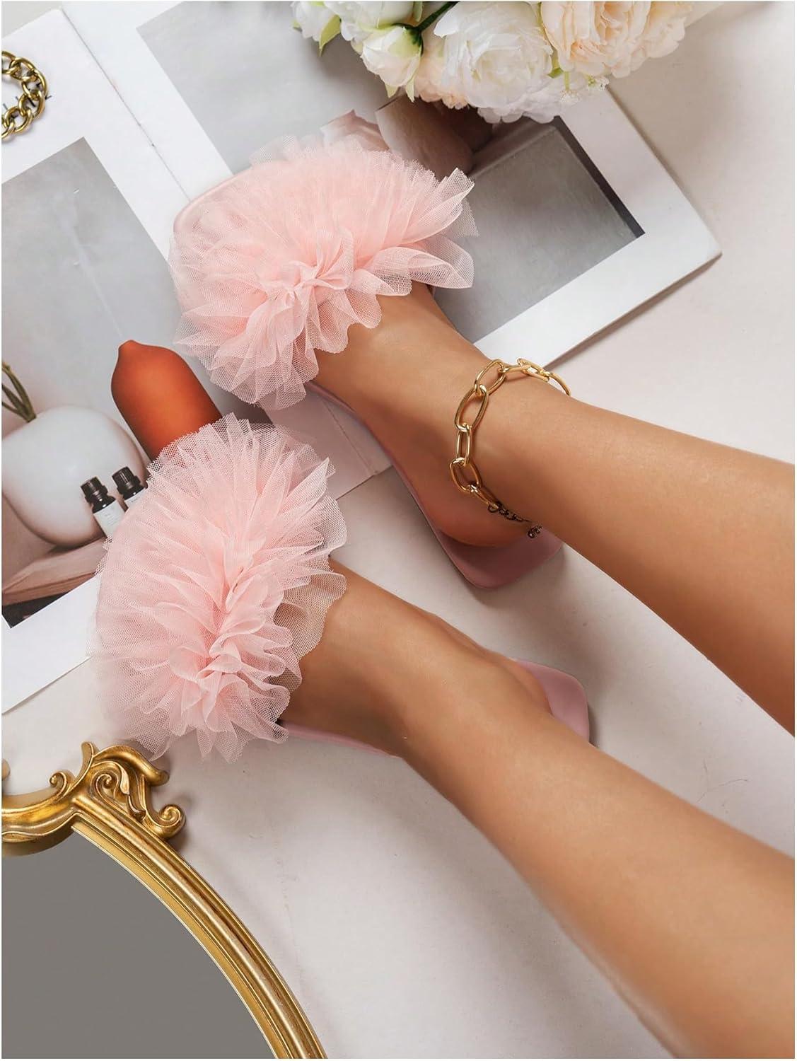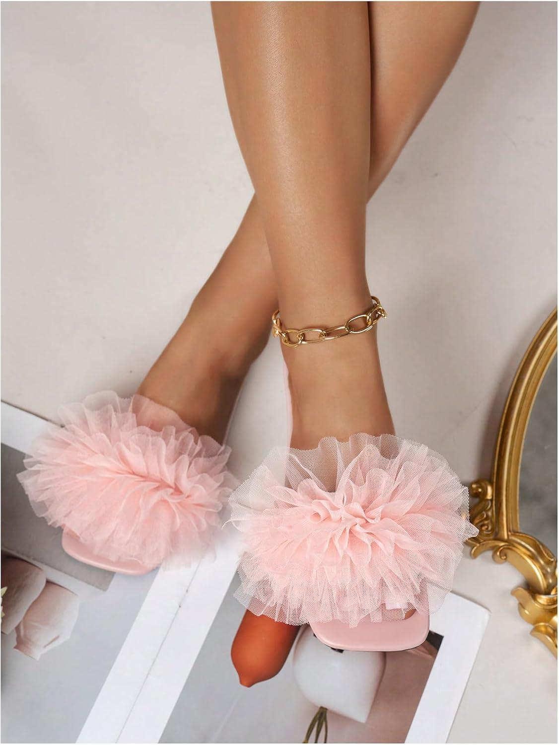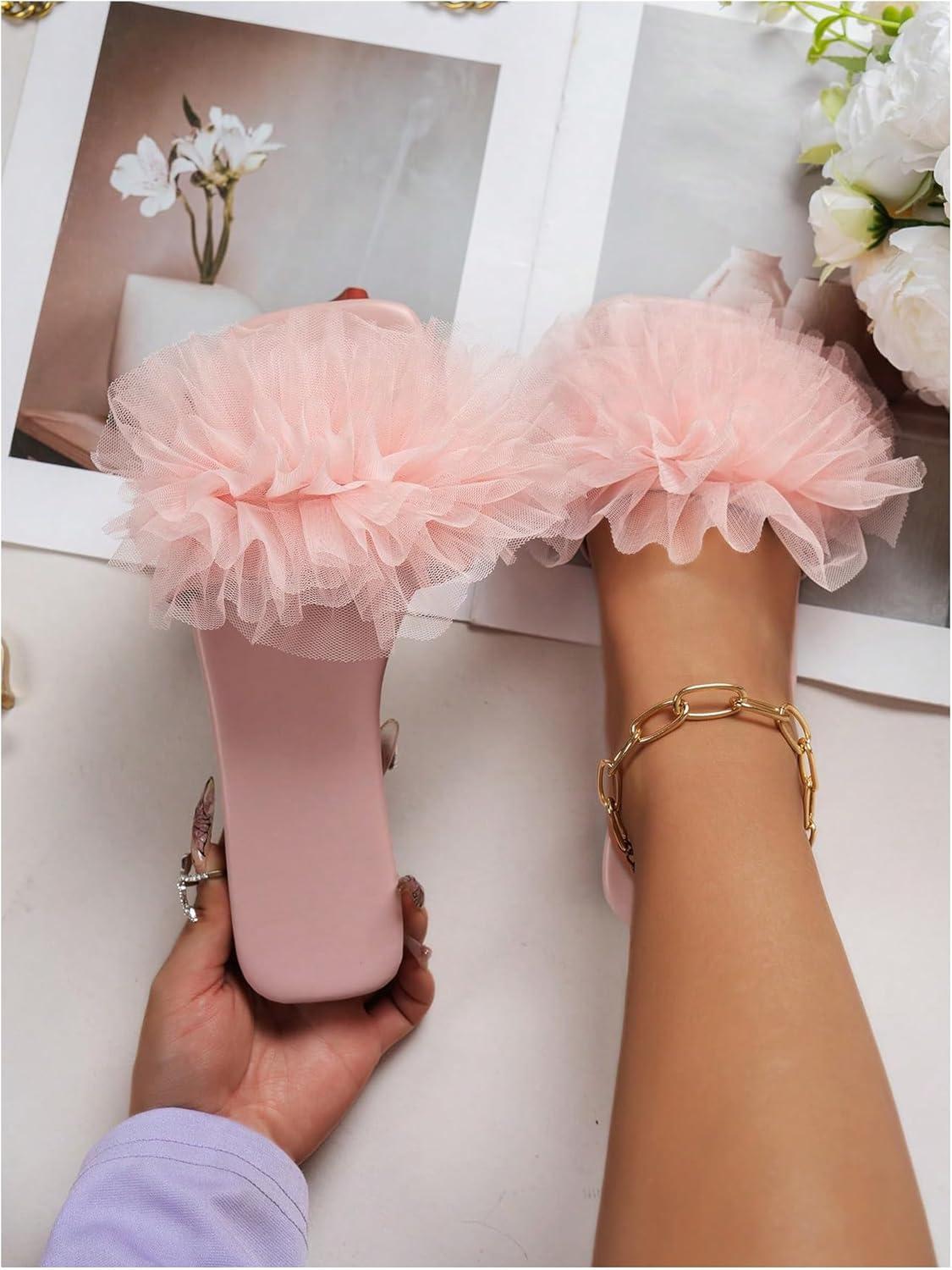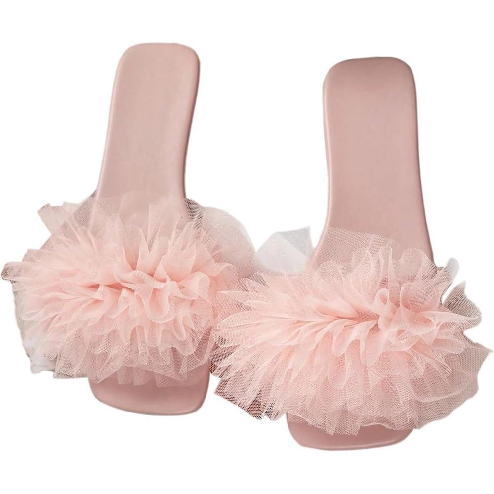 OYOANGLE Women's Square Open Toe Slide Sandals Sheer Ruffle Dressy Slip on Flat Sandal(Pink)