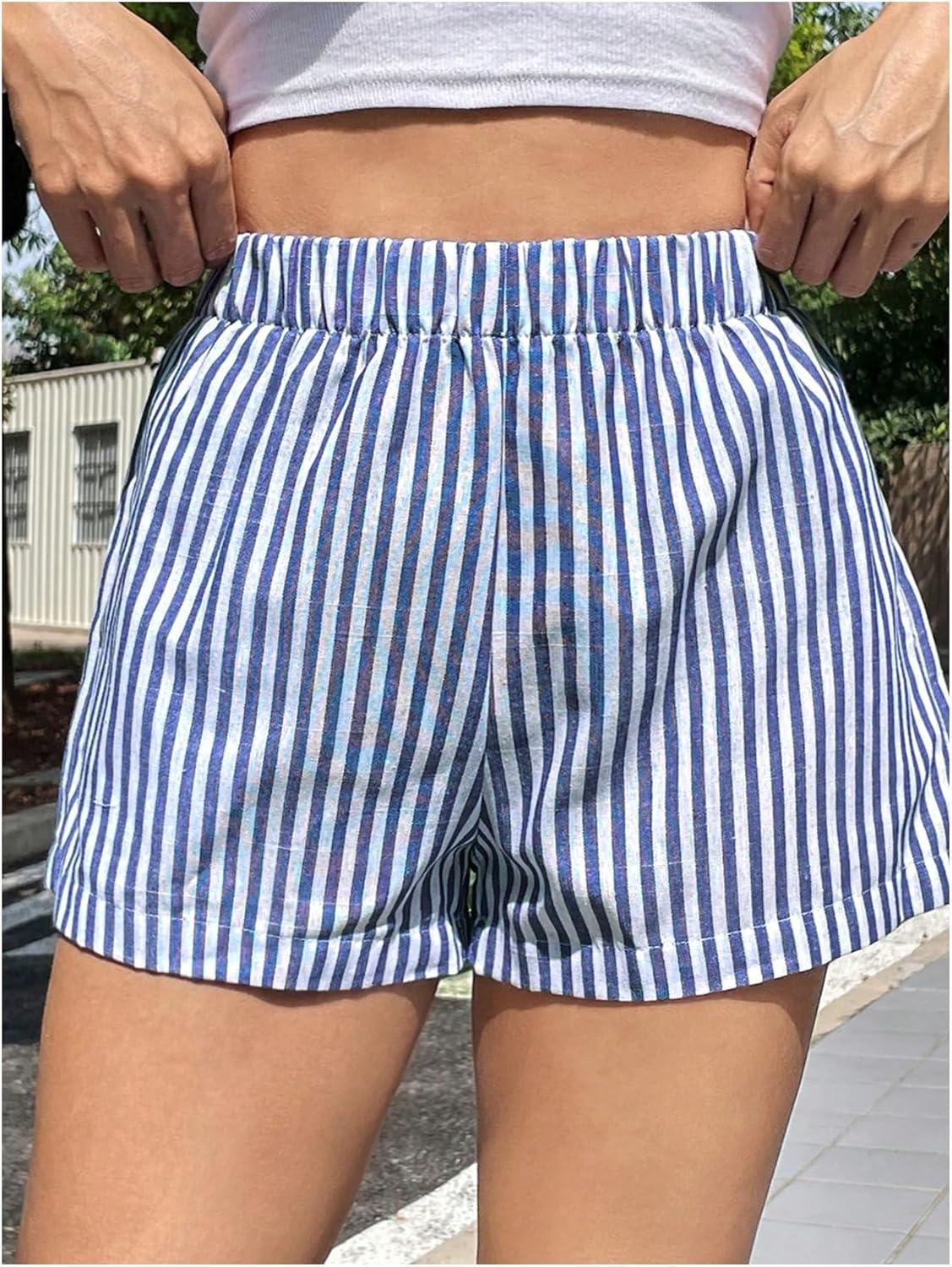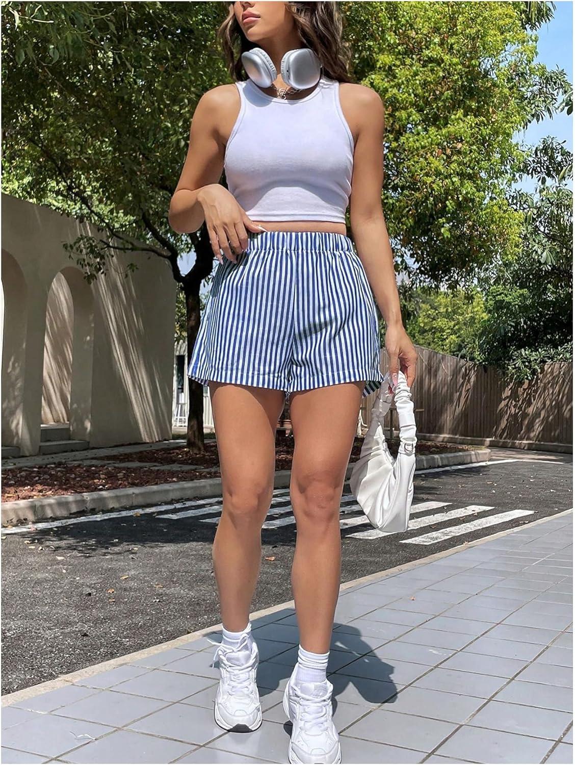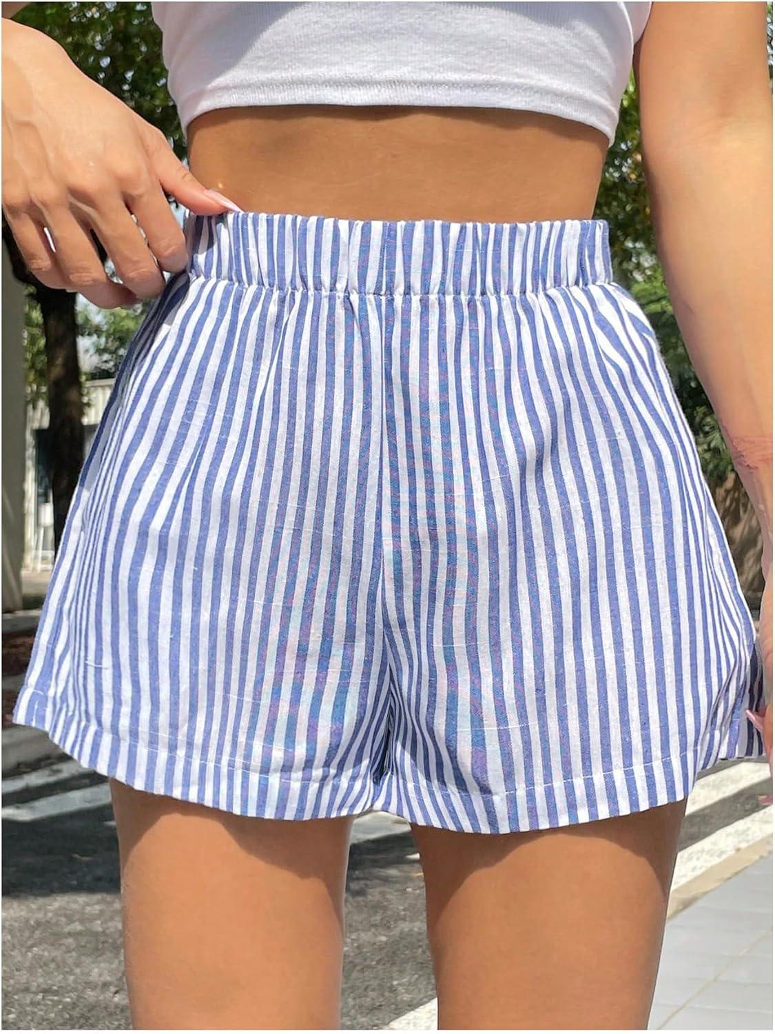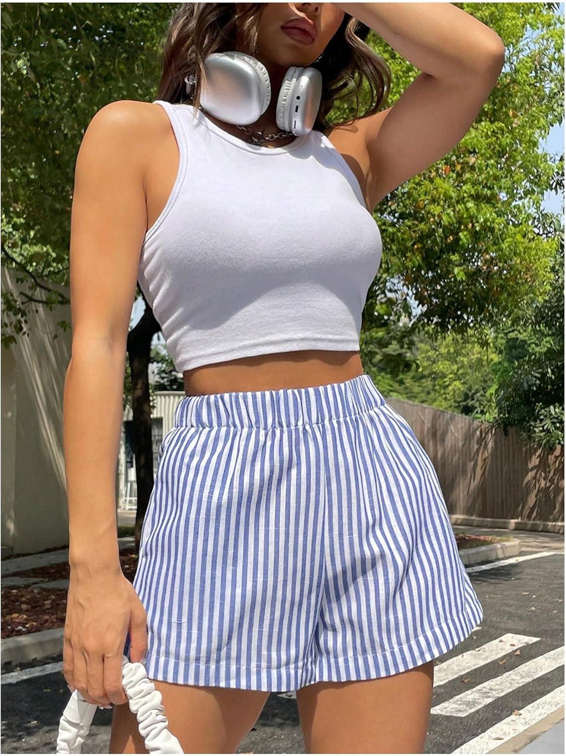 imageOYOANGLE Womens Striped Print High Waisted Shorts Elastic Waist Wide Leg Loose Casual ShortsBlue and White