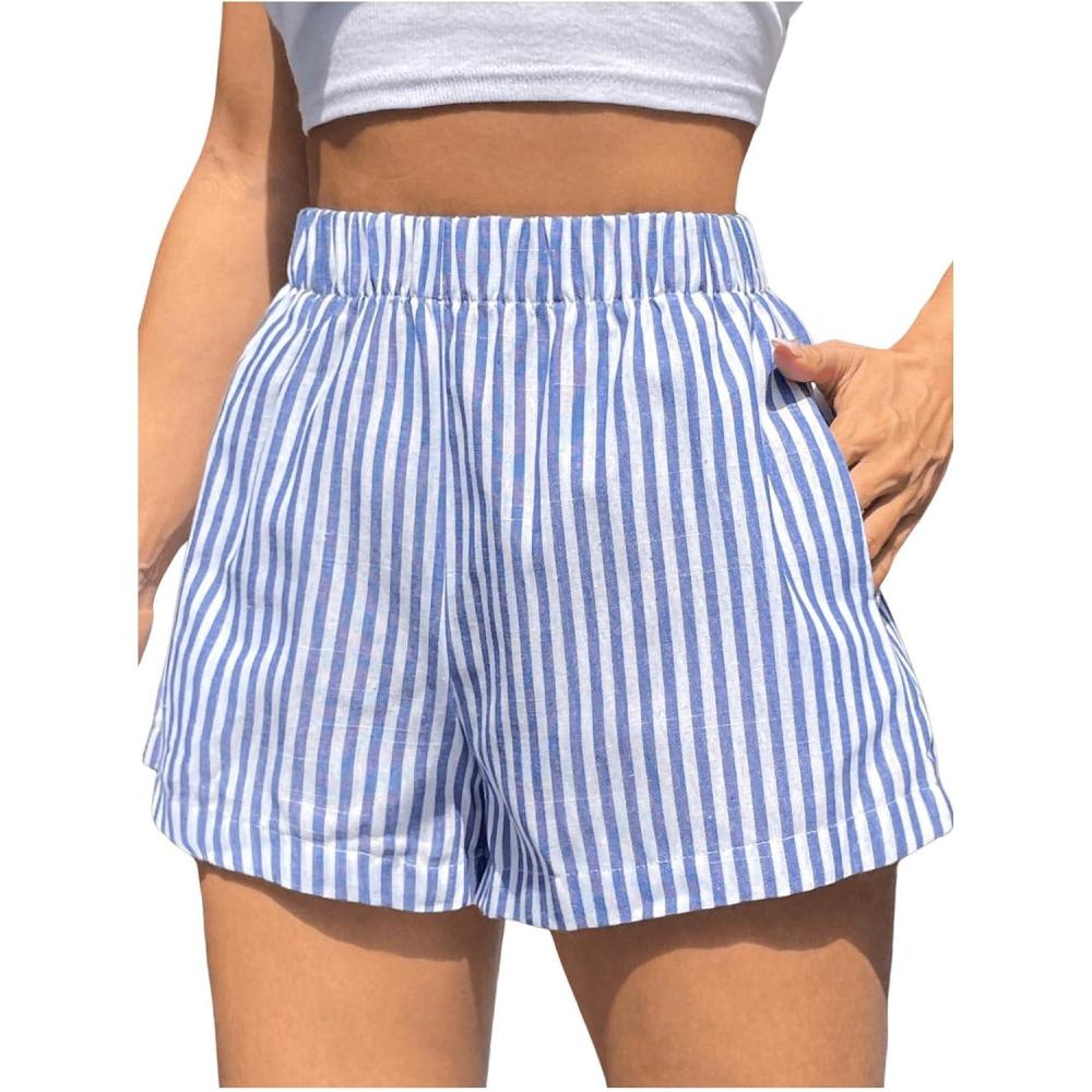 OYOANGLE Women's Striped Print High Waisted Shorts Elastic Waist Wide Leg Loose Casual Shorts(Blue and White)