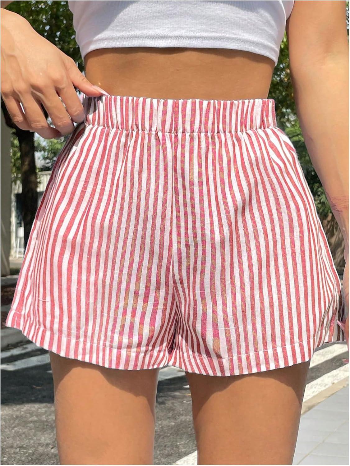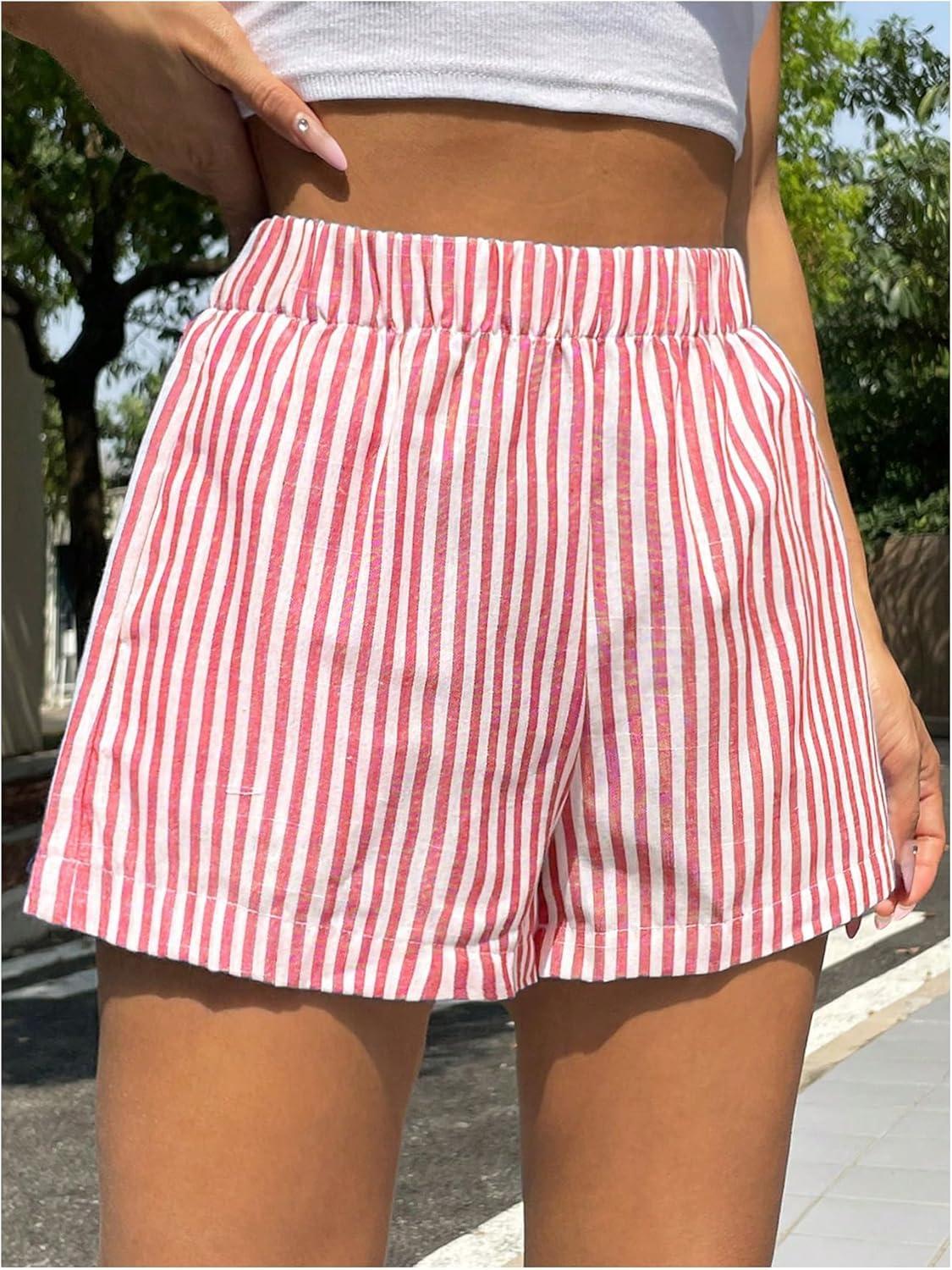 OYOANGLE Women's Striped Print High Waisted Shorts Elastic Waist Wide Leg Loose Casual Shorts(Red)