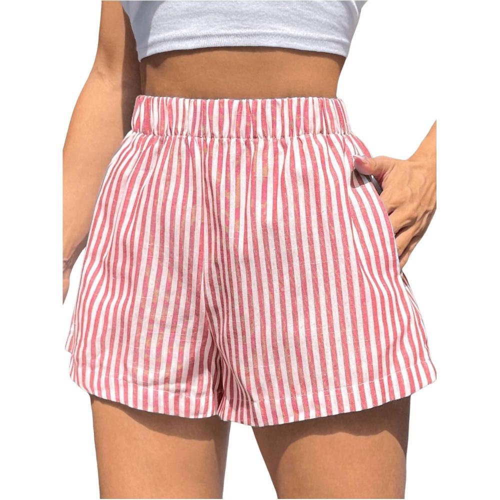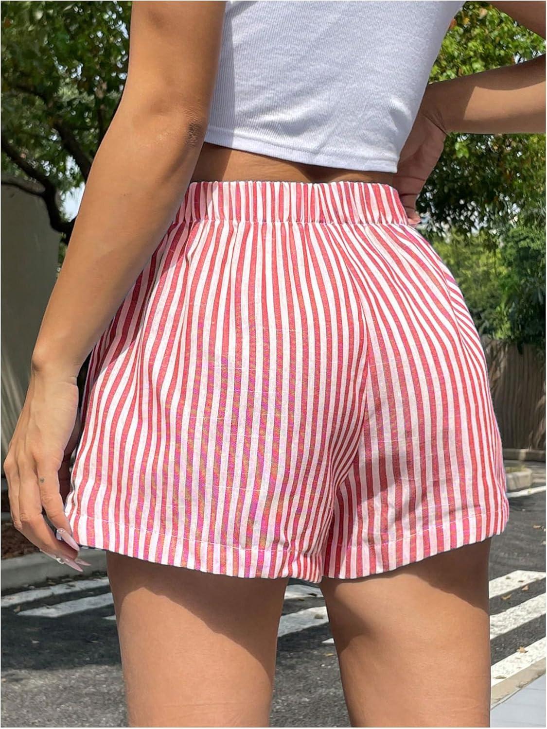 imageOYOANGLE Womens Striped Print High Waisted Shorts Elastic Waist Wide Leg Loose Casual ShortsRed