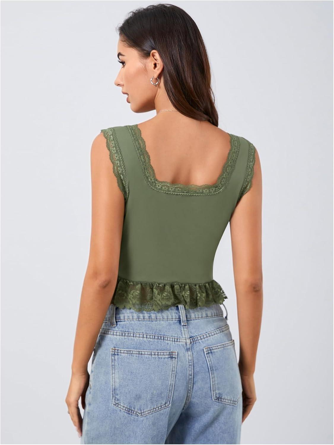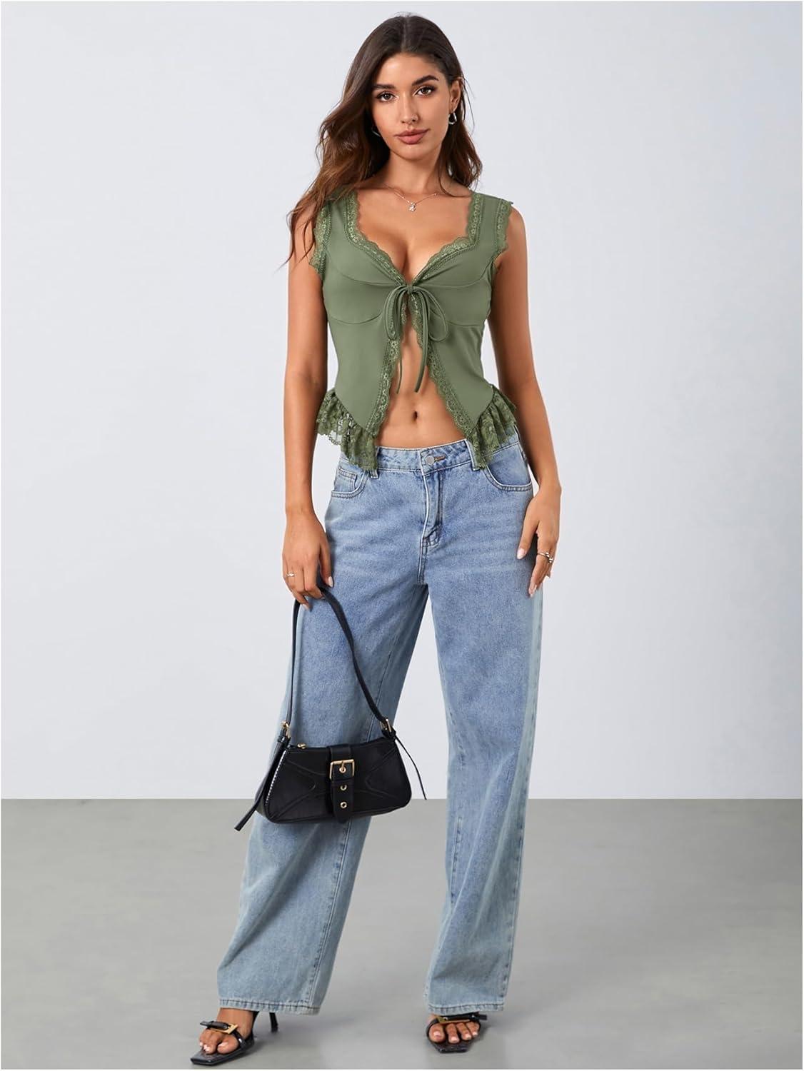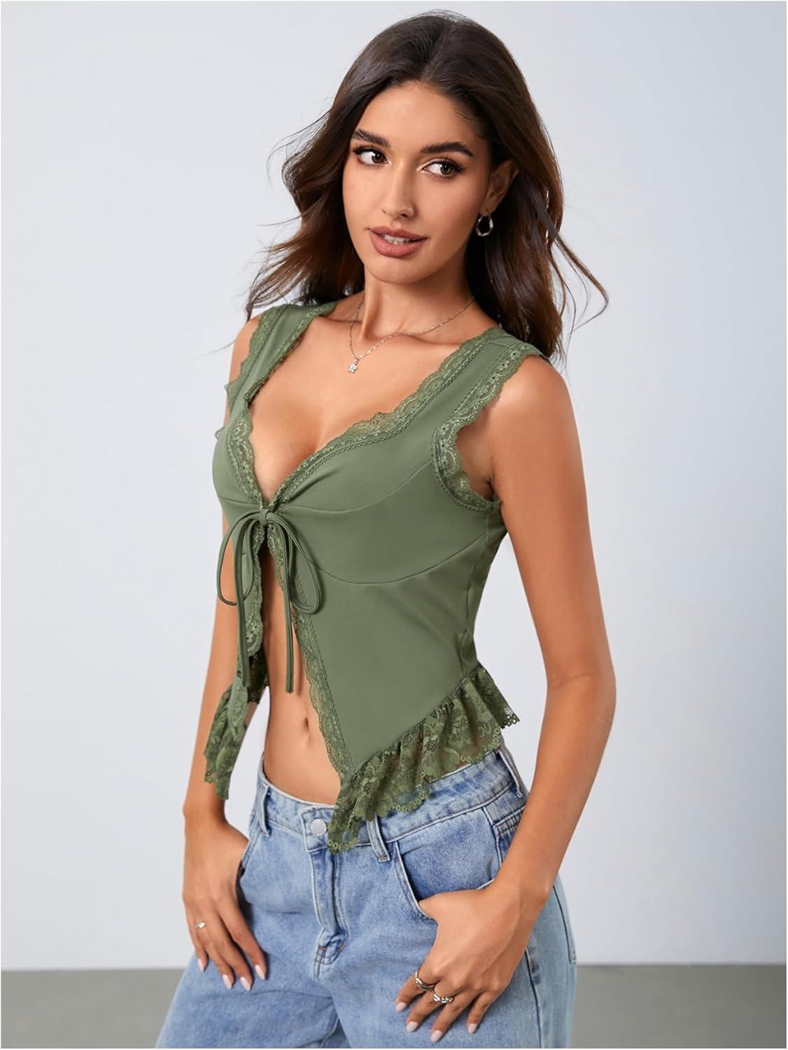 OYOANGLE Women’s Summer Casual Tie Front Top Sleeveless V Neck Lace Trim Going Out Crop Blouse(Army Green)