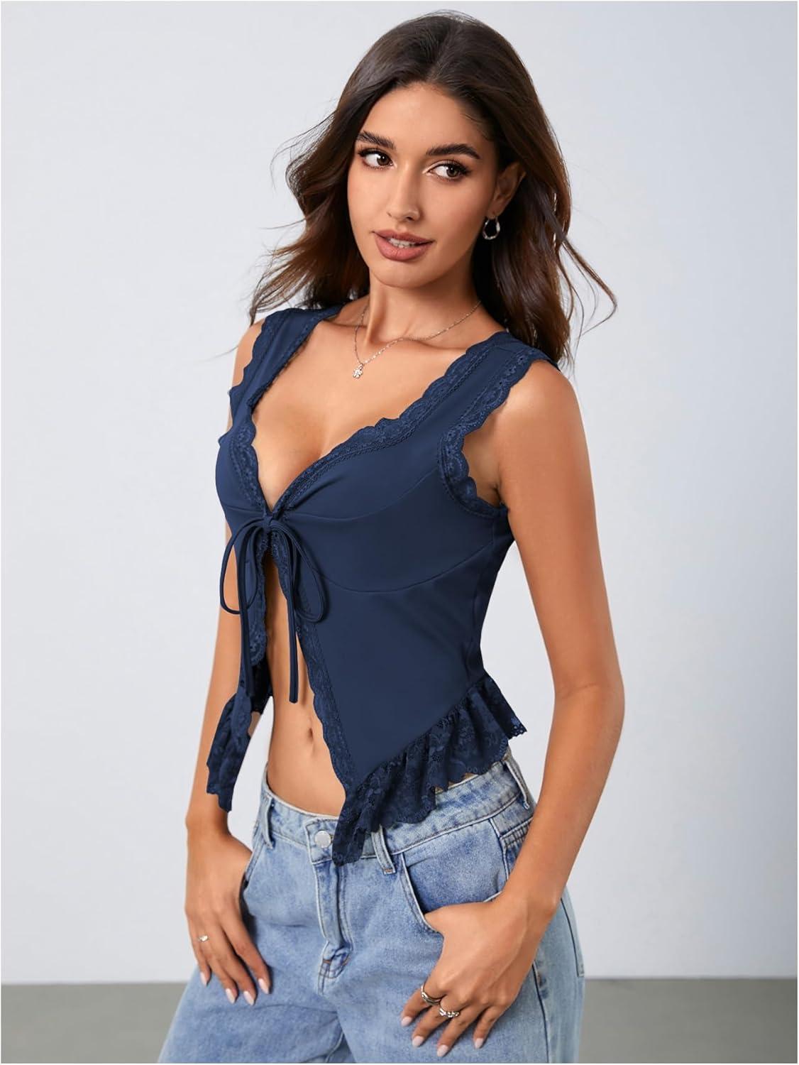 OYOANGLE Women's Summer Casual Tie Front Top Sleeveless V Neck Lace Trim Going Out Crop Blouse(Royal Blue)