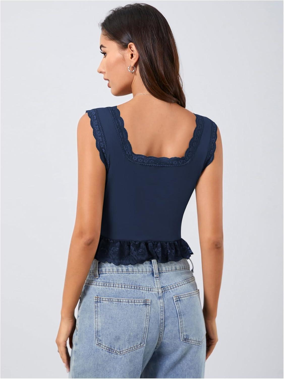 imageOYOANGLE Womens Summer Casual Tie Front Top Sleeveless V Neck Lace Trim Going Out Crop BlouseRoyal Blue