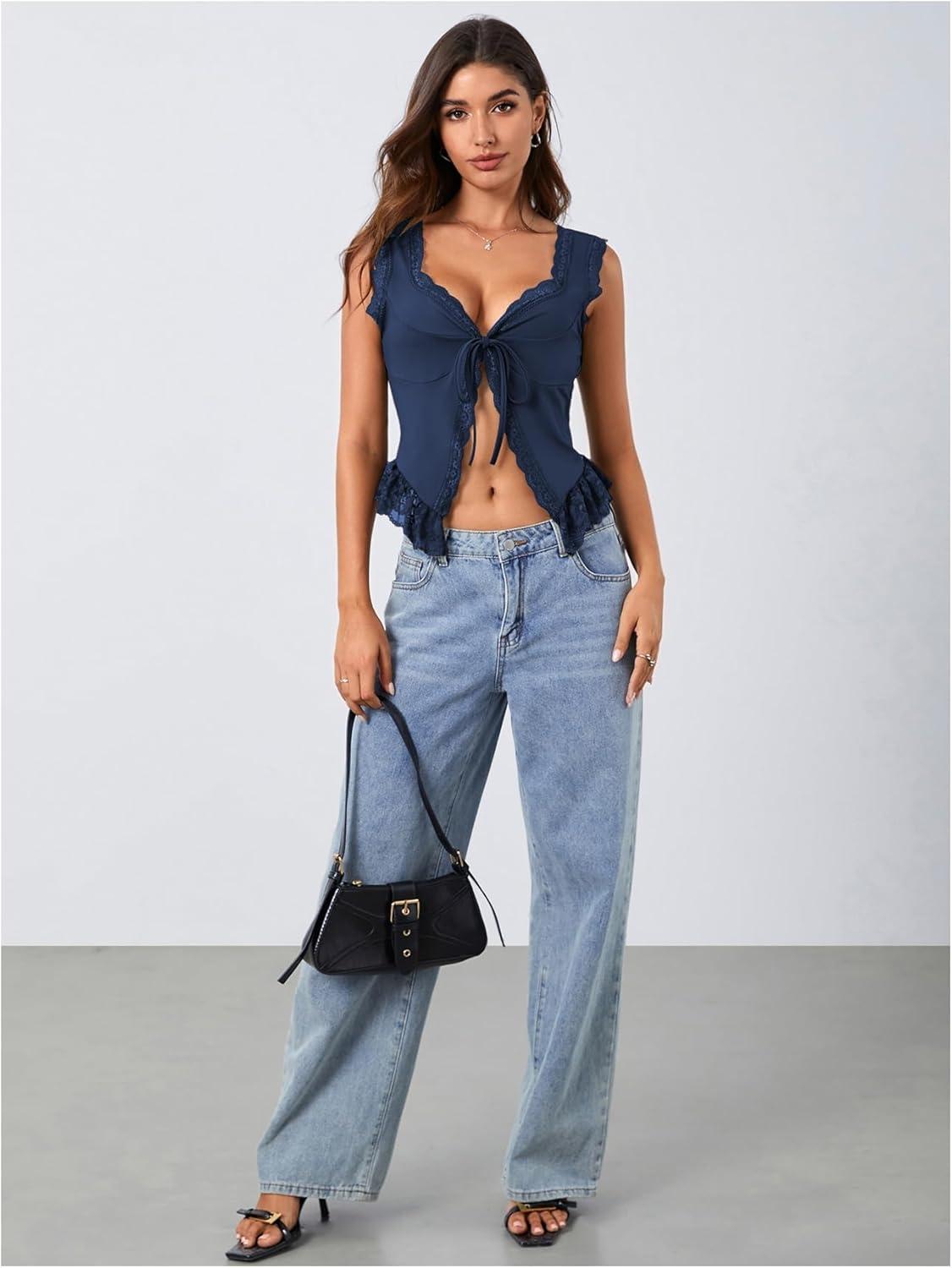 OYOANGLE Women’s Summer Casual Tie Front Top Sleeveless V Neck Lace Trim Going Out Crop Blouse(Royal Blue)