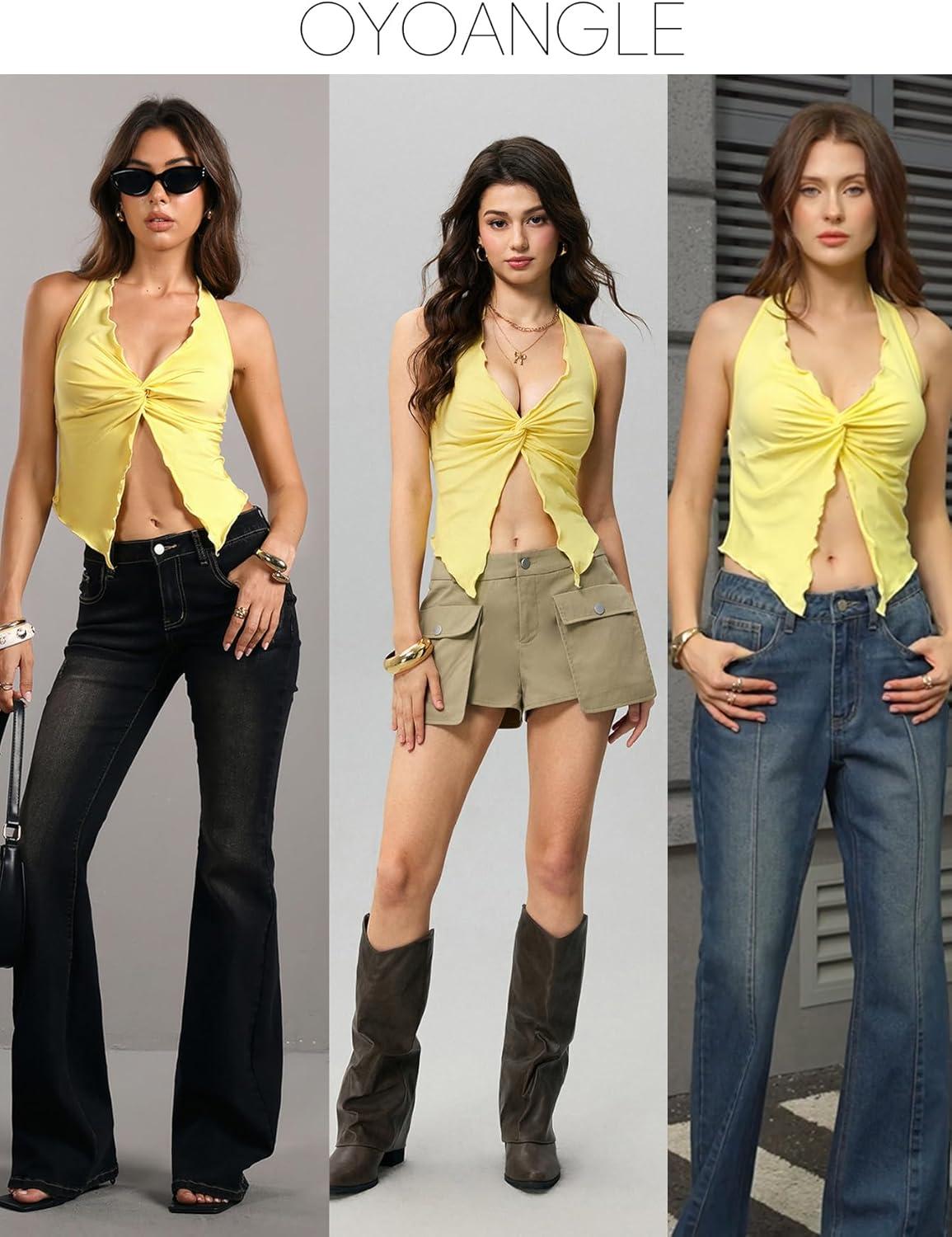 OYOANGLE Women’s Twist Front Ruched Halter Top Y2K Sleeveless Front Slit Open Back Cropped Tops(Yellow)
