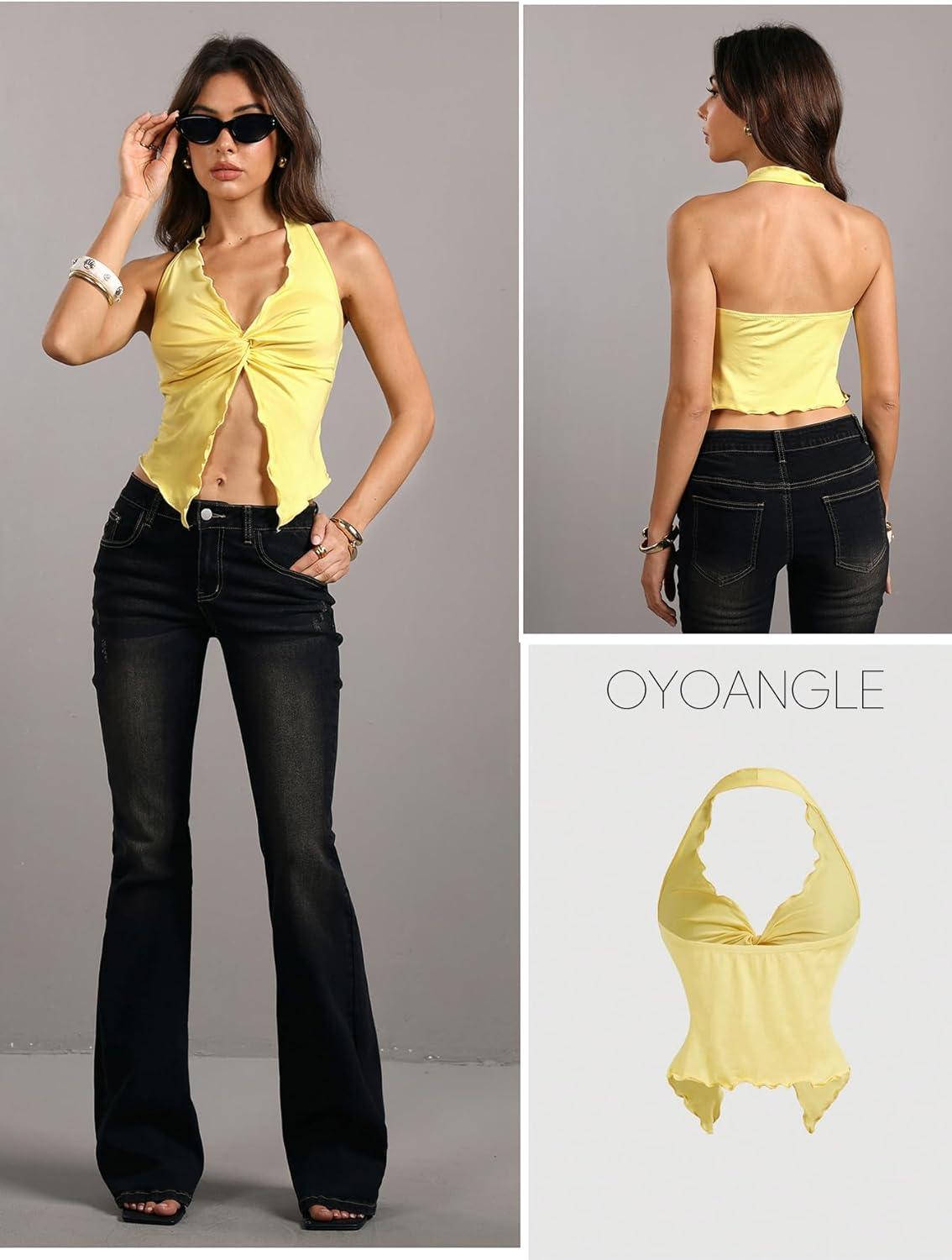 Be the first to review “OYOANGLE Women’s Twist Front Ruched Halter Top Y2K Sleeveless Front Slit Open Back Cropped Tops(Yellow)”