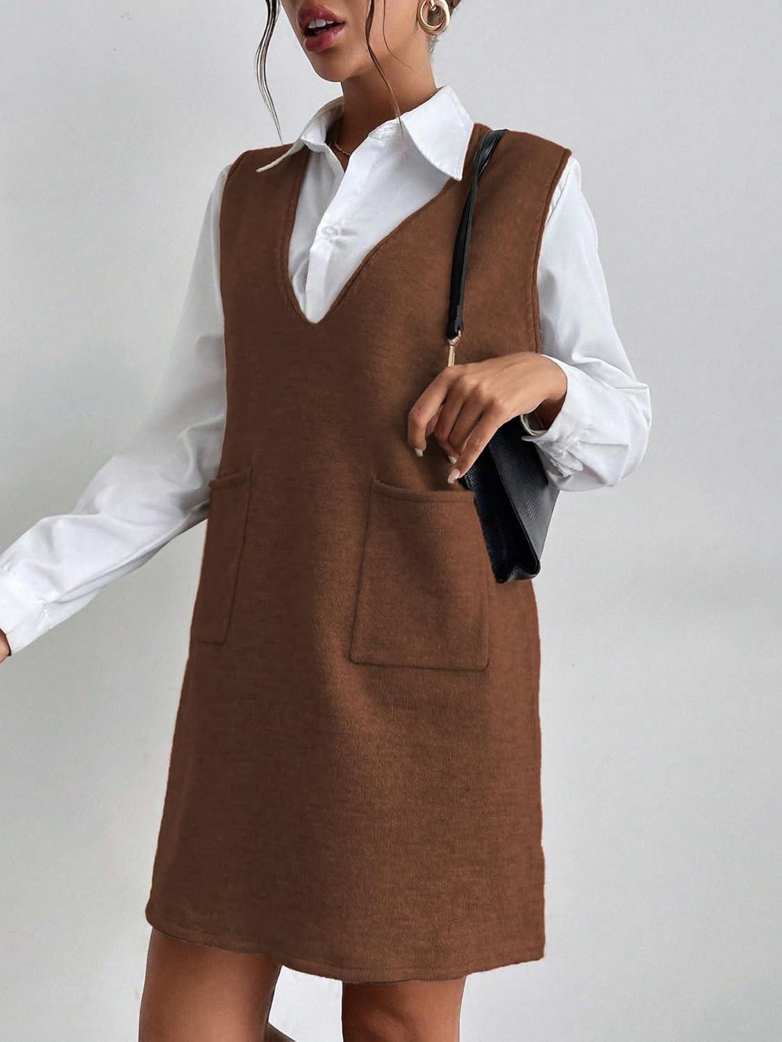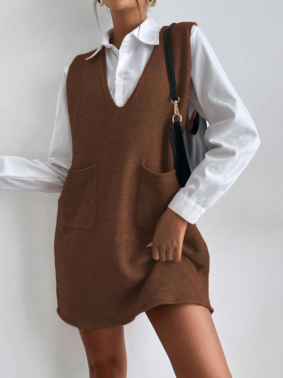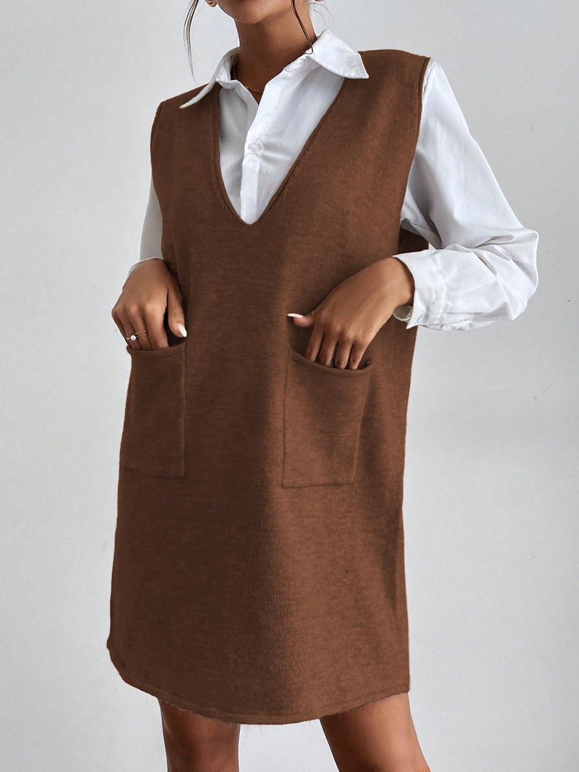 imageOYOANGLE Womens V Neck Sleeveless Knitted Solid Short Sweater Dress with PocketsChocolate Brown