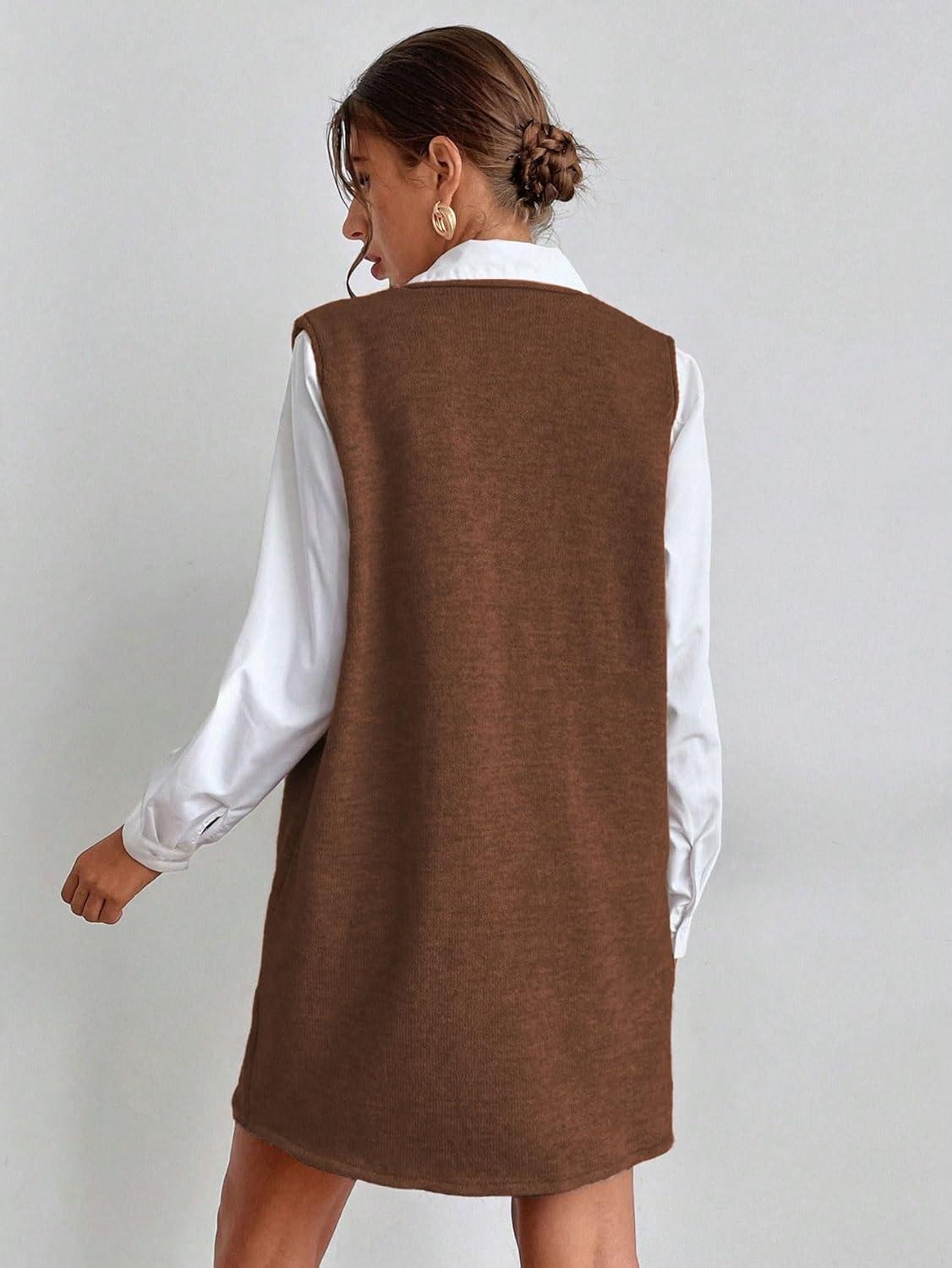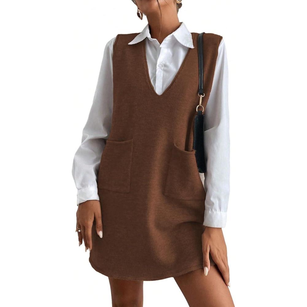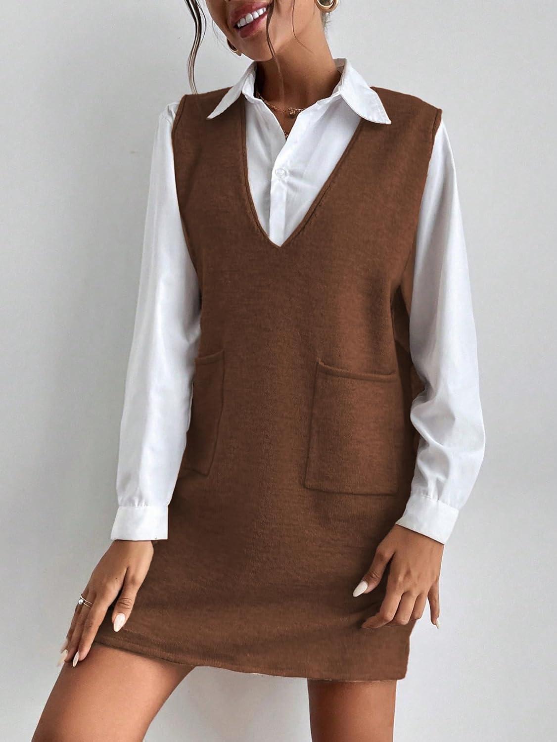 imageOYOANGLE Womens V Neck Sleeveless Knitted Solid Short Sweater Dress with PocketsChocolate Brown