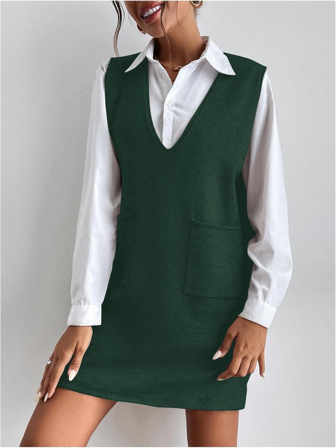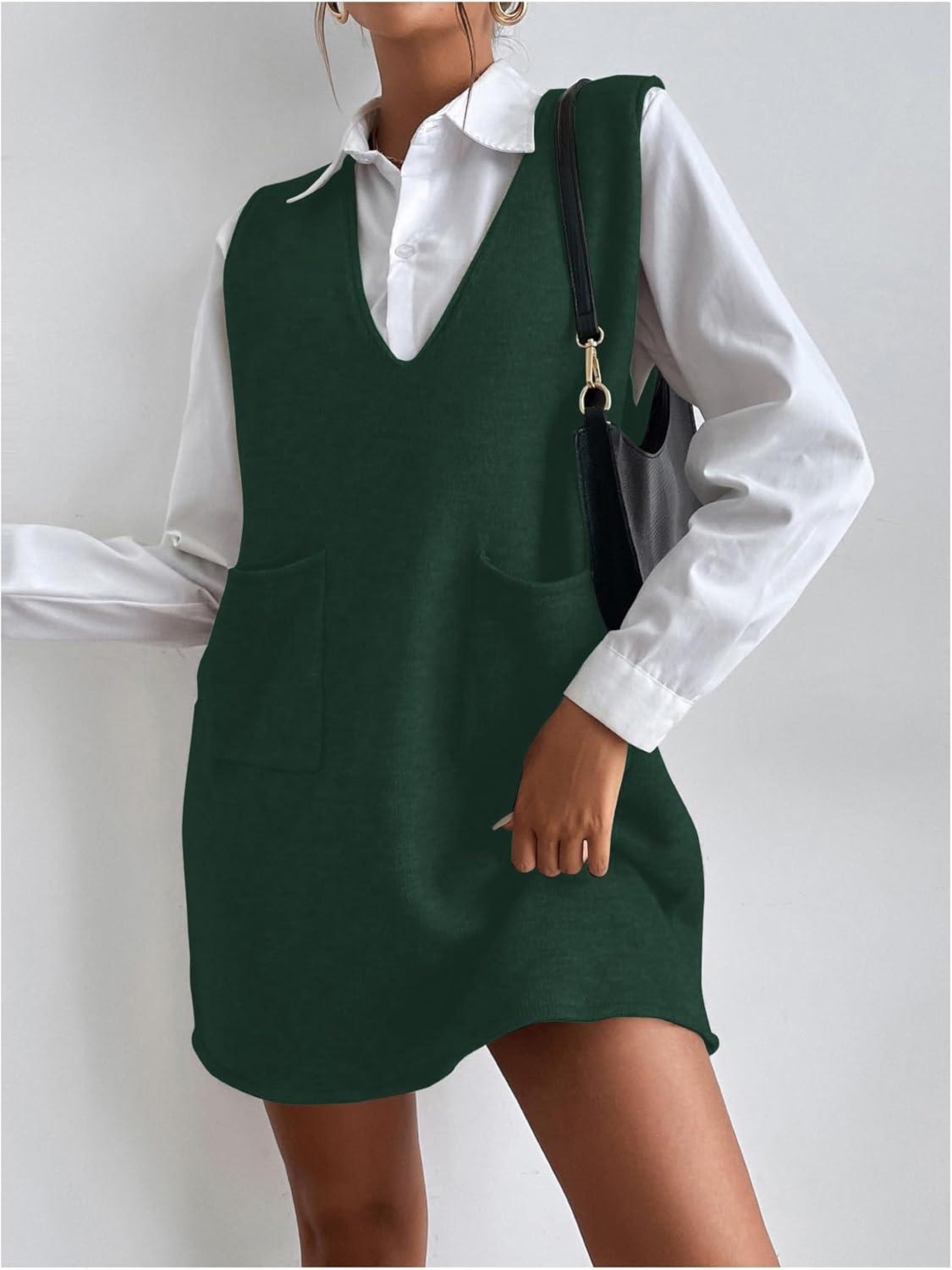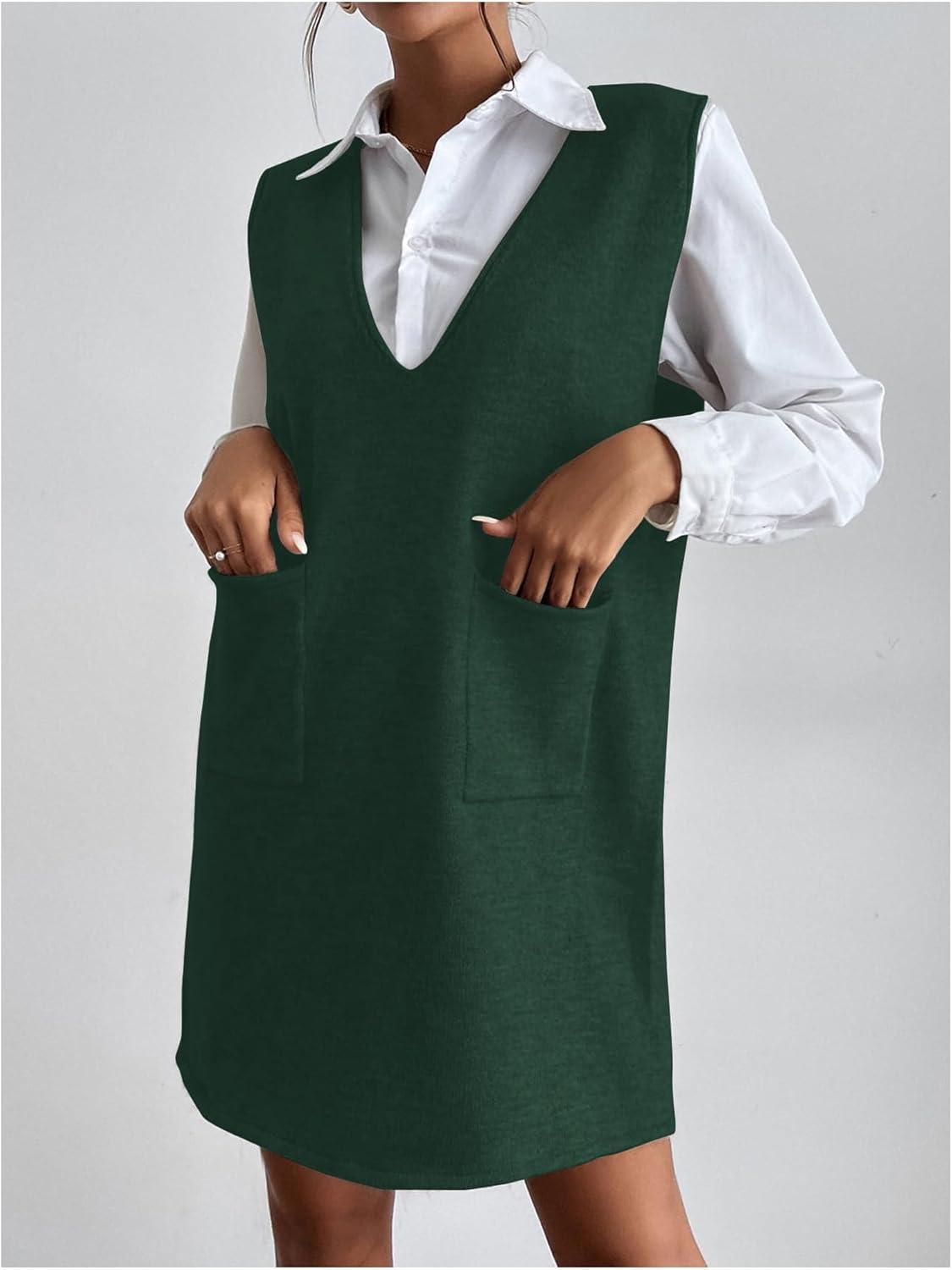 imageOYOANGLE Womens V Neck Sleeveless Knitted Solid Short Sweater Dress with PocketsDeep Green