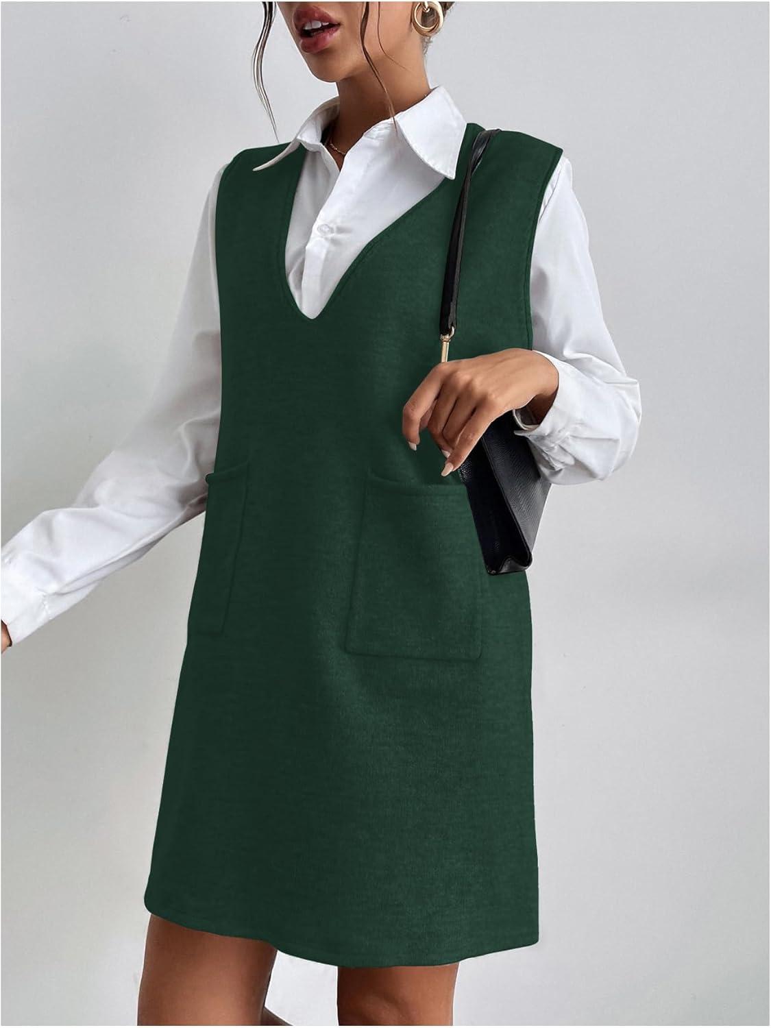 OYOANGLE Women’s V Neck Sleeveless Knitted Solid Short Sweater Dress with Pockets(Deep Green)