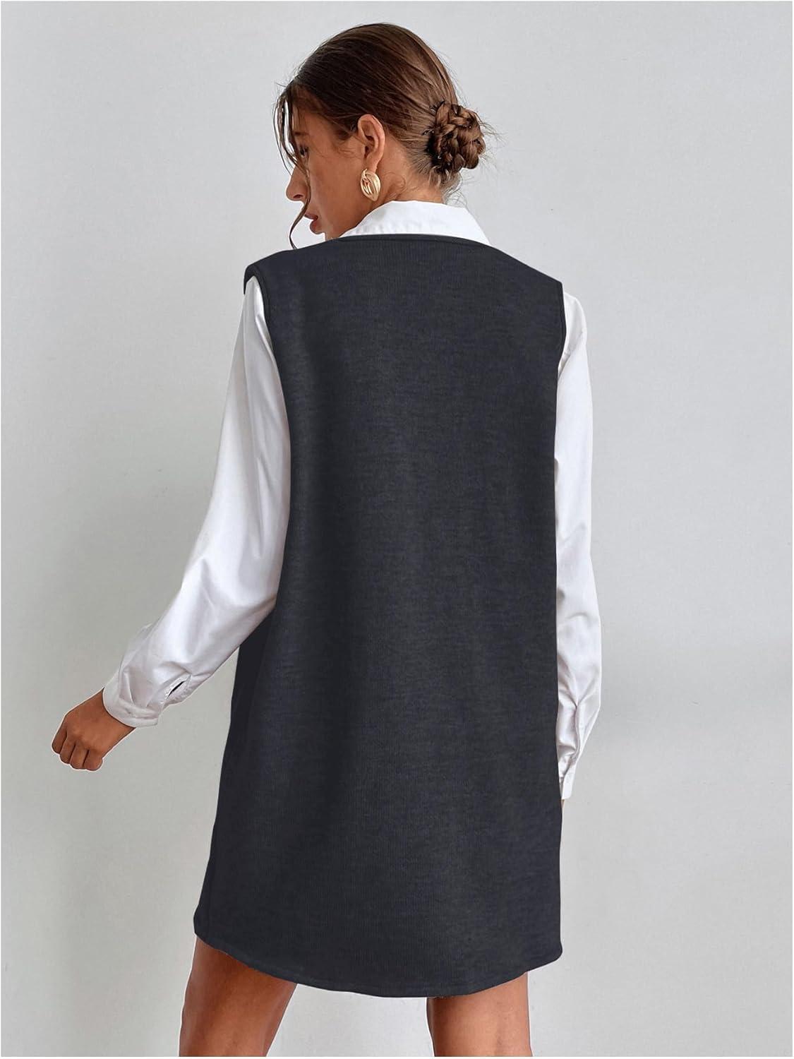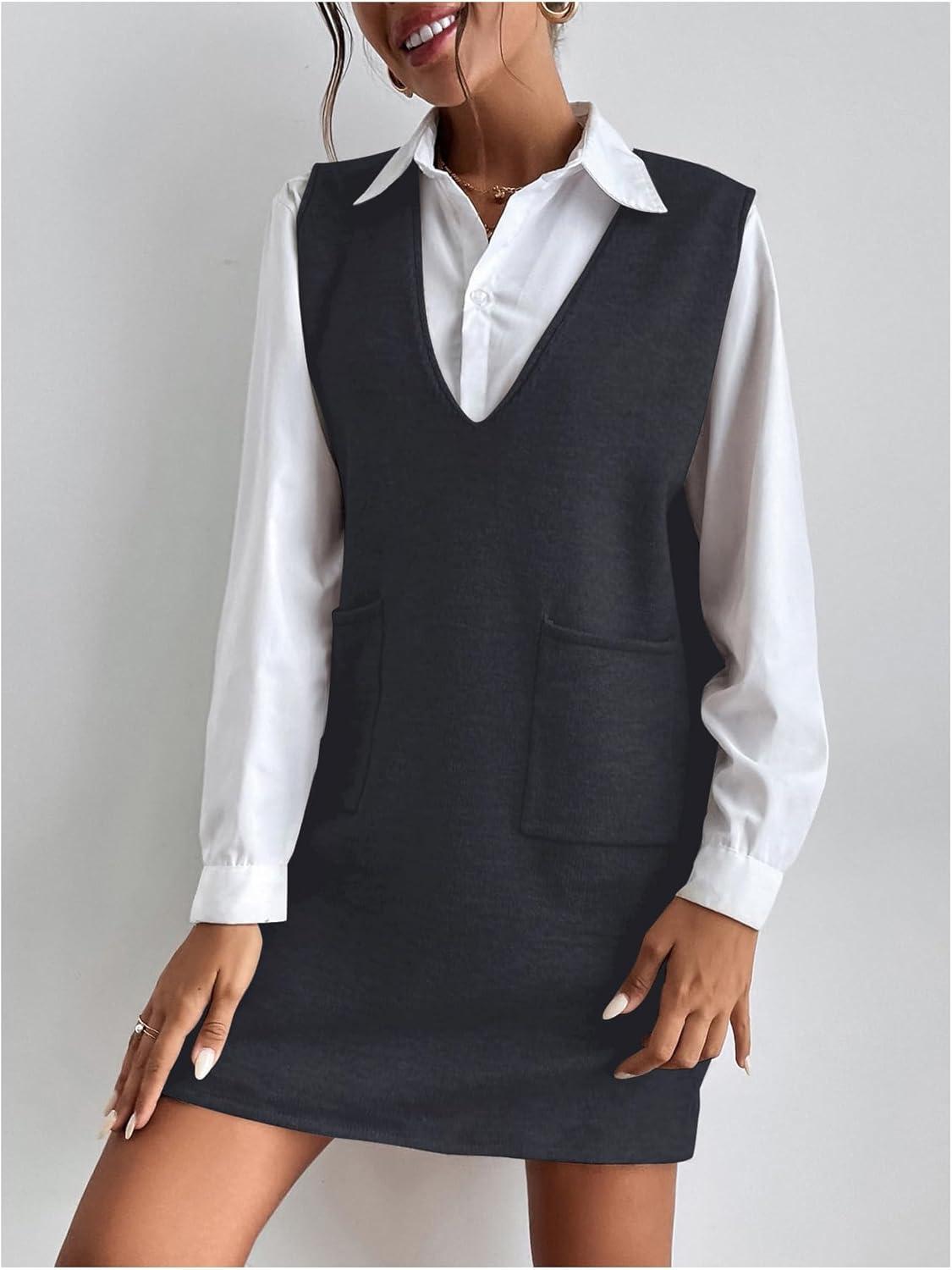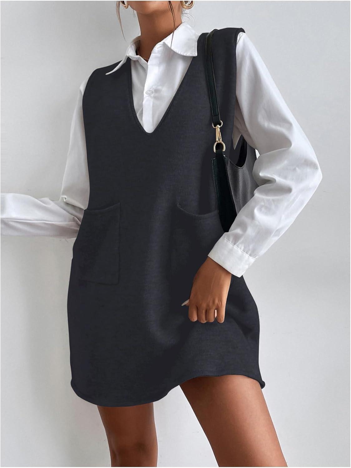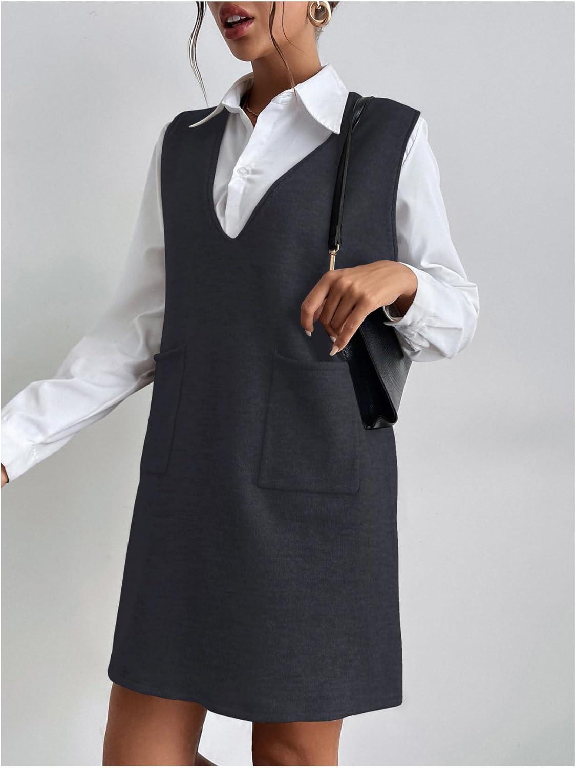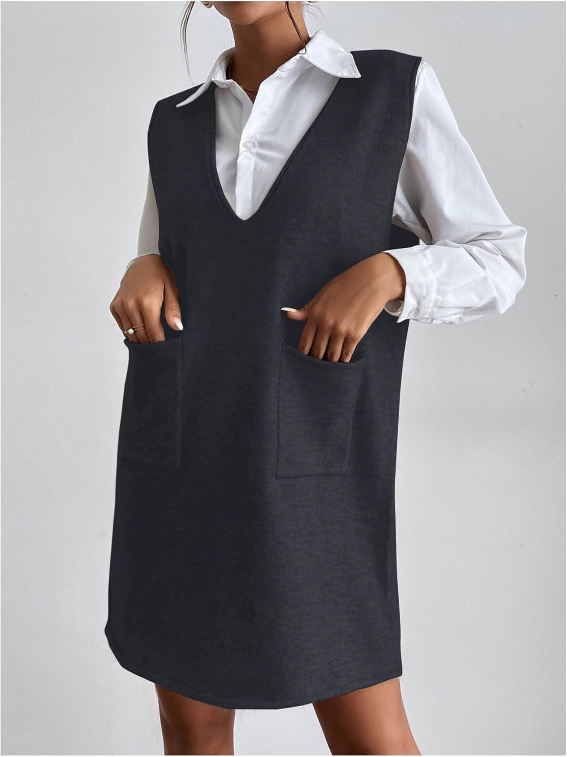OYOANGLE Women’s V Neck Sleeveless Knitted Solid Short Sweater Dress with Pockets(Deep Grey)
